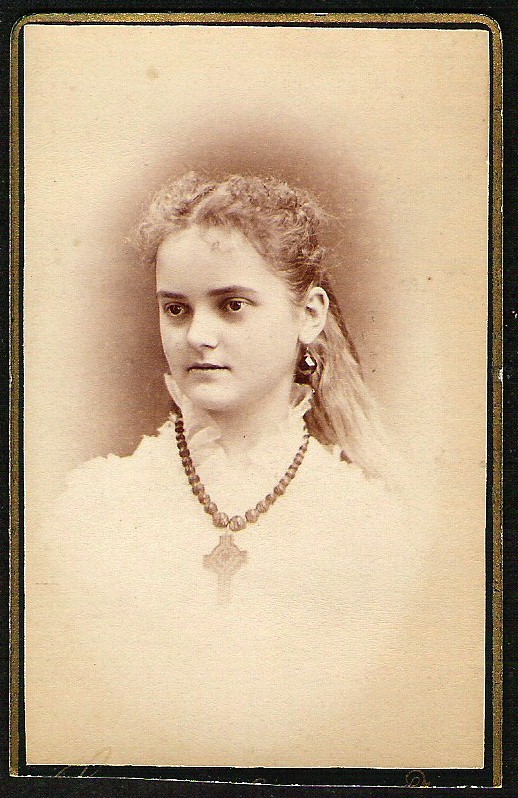 Depicting a beautiful young girl with long light hair and dark eyes, wearing a big ornate cross necklace.