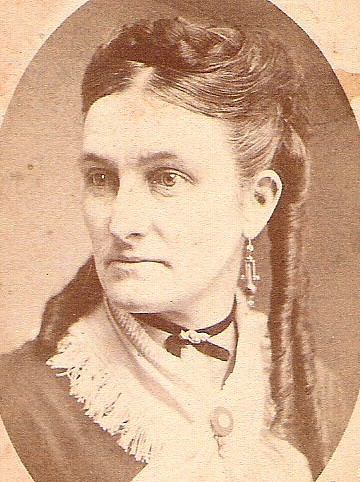 Depicting a sepia oval photo, head and shoulders view, studio portrait of unidentified mature lady with long curly hair, looks away from camera with a serious expression, wears a dark-colored dress with white collar or scarf, the scarf is tied with a brooch. Wearing her unique jeweled collar band ribbon around her neck and beautiful earrings.