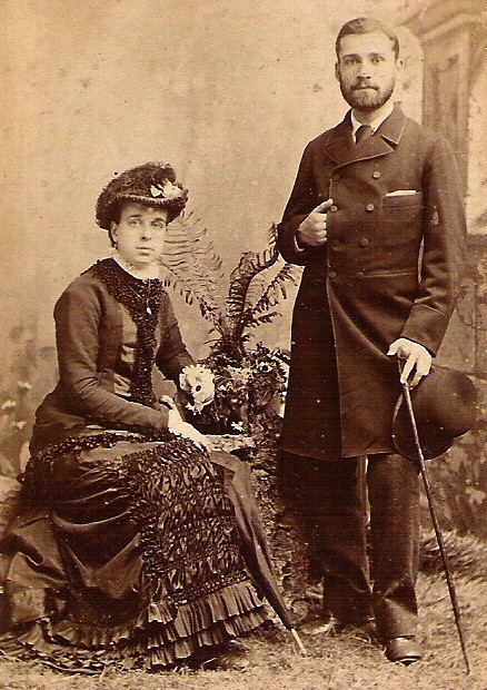 Depicting a sepia photo, Full length view, studio portrait of unidentified elegant couple, looking straight into the camera with a serious expression on their faces. The seated lady wears fashionable elegant dark-colored dress, a beautiful hat and her jewelry, holding a flower in her hand.