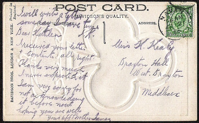 Written on back: hand-written, printed with the Publisher name and location, “Printed in England”, a half penny British postal stamp.