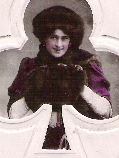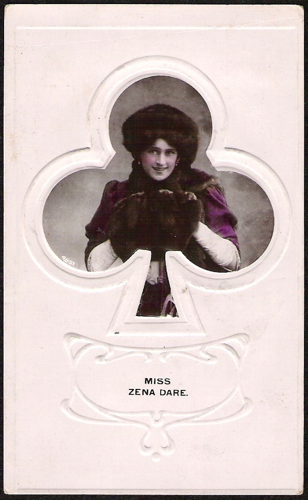 Depicting the gorgeous Edwardian Actresses Miss Zena Dare Photograph Postcards, dressed in purple dress and fur with a big smile on her face. All within an embossed clover leaf "Lucky clover".