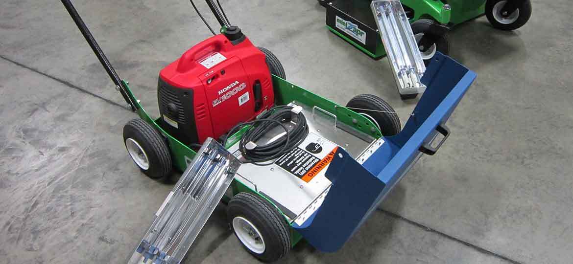 For UVC light intensity we chose to employ a base reflector module with 8 proprietary, high energy UVC bulbs and a hand-held unit with 2 high energy UVC bulbs. The unit can be powered by an on-board generator (outdoor use) or through a standard 110v wall outlet (with a 50 foot power cord).