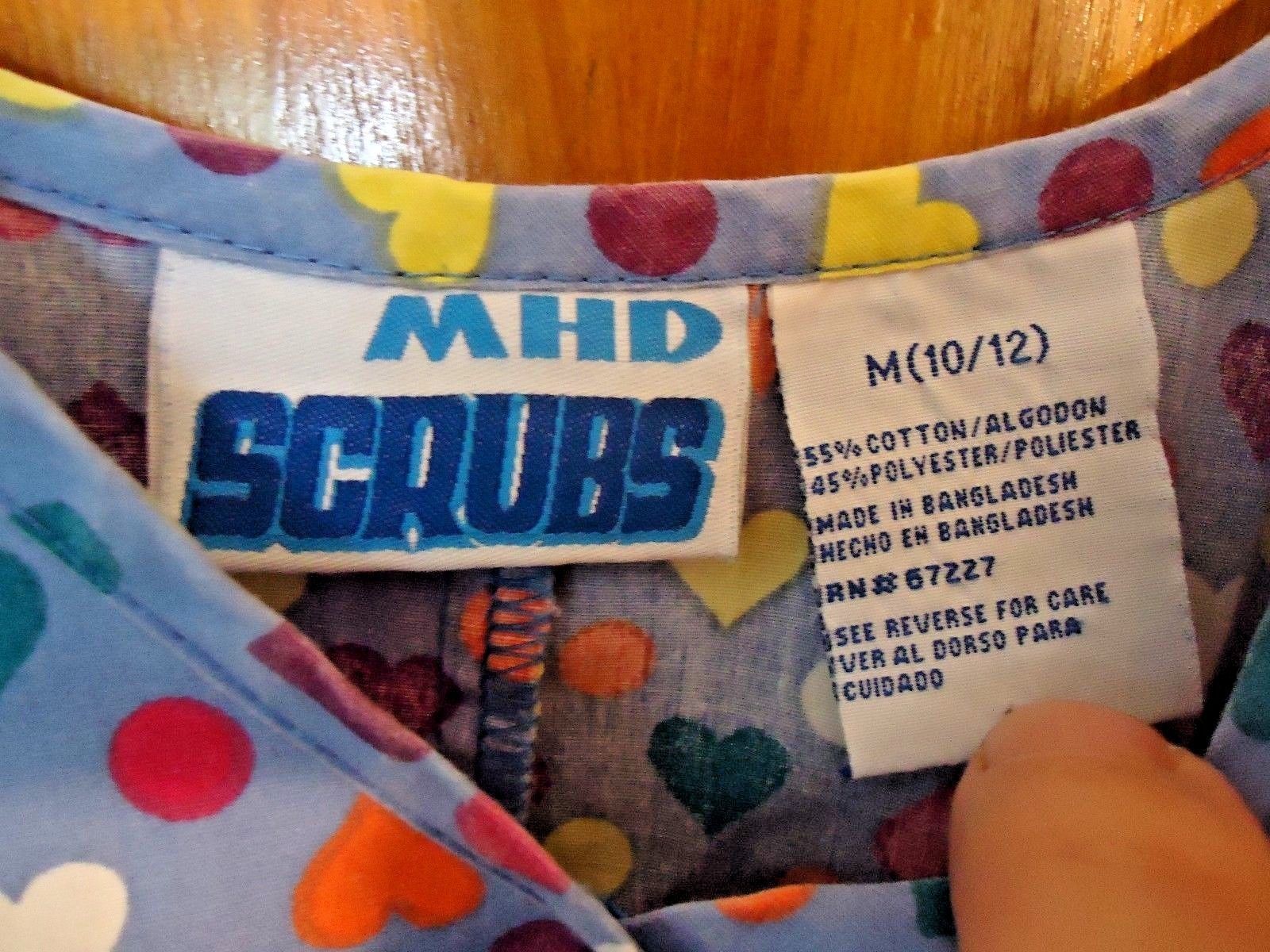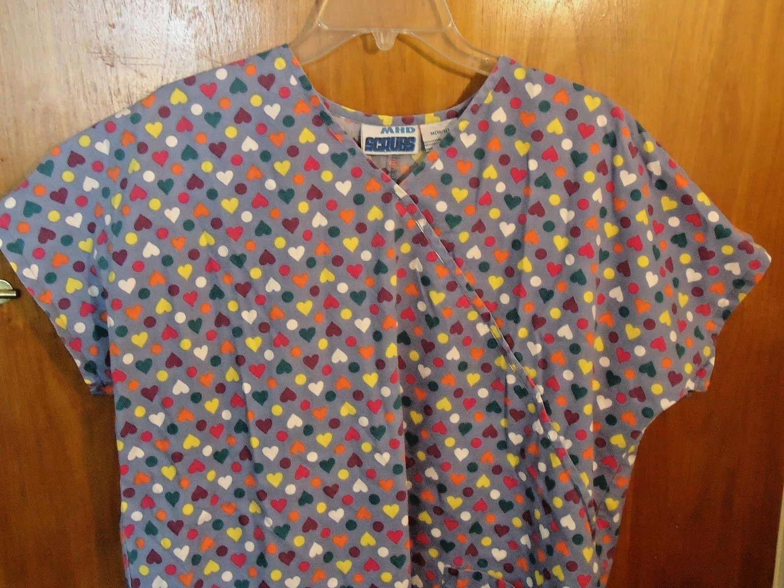 MHD Size M 10-12 Heart & Circle Themed Blue Multi Color Scrubs Top " BEAUTIFUL "