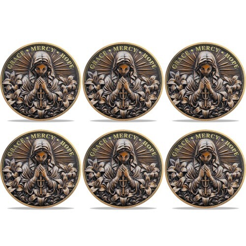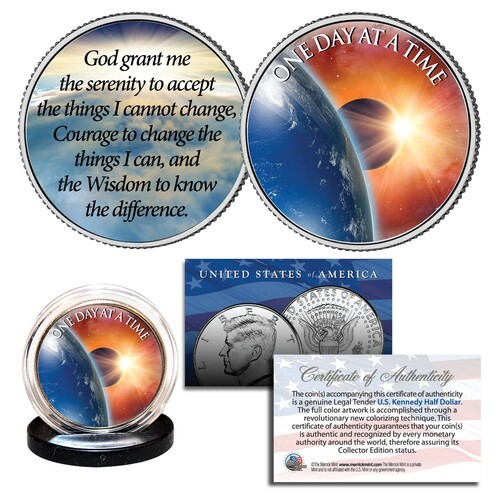 Here is your opportunity to own the PRAYING HANDS - Serenity Prayer collectible coin. This colorized JFK Kennedy Half Dollar U.S. Coin has been enhanced with beautiful colorized images by the Merrick Mint. Each coin comes in a premium coin capsule with a full color Certificate of Authenticity to guarantee that your coin is authentic and recognized by every monetary authority around the world, assuring its Collector Edition status. This Legal Tender United States coin has been colorized with an application of special inks directly to the surface of the coin, using a unique and painstakingly multicolor coin process, which achieves a level of detail, color saturation, and durability that is #1 in the coin industry. The result is an everlasting colorized coin collectible of ultra-high quality. The Kennedy half dollar is a U.S. fifty cent coin with coin year and mint marks chosen at random.