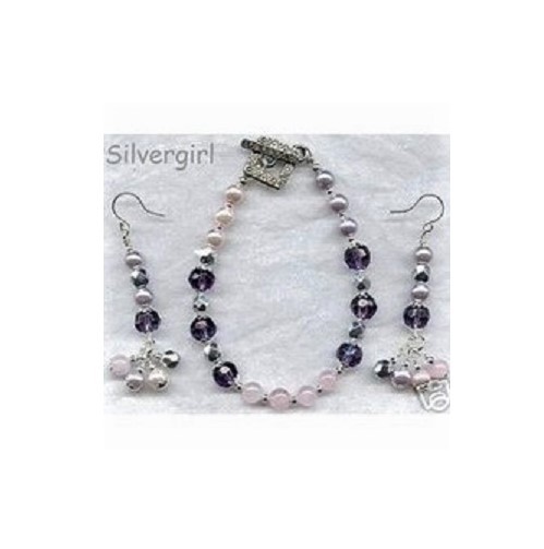 Amethyst Rose Quartz Pearl Crystal Bracelet Earring Set