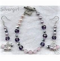 This set is lovingly hand made with 6mm rose quartz stones, 8mm juicy amethyst celestial crystal beads, pretty 6mm pink and purple glass imitation pearls, 6mm silver plated faceted balls, silver plated bead caps and 2mm spacer balls and an antique looking silver plated square toggle clasp. The bracelet is about 7 1/2" long and the matching earrings are about 2 1/2" long with silver plated surgical steel hooks
