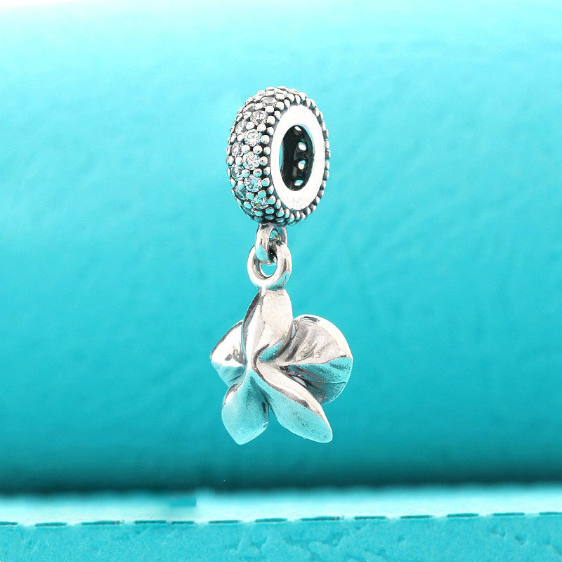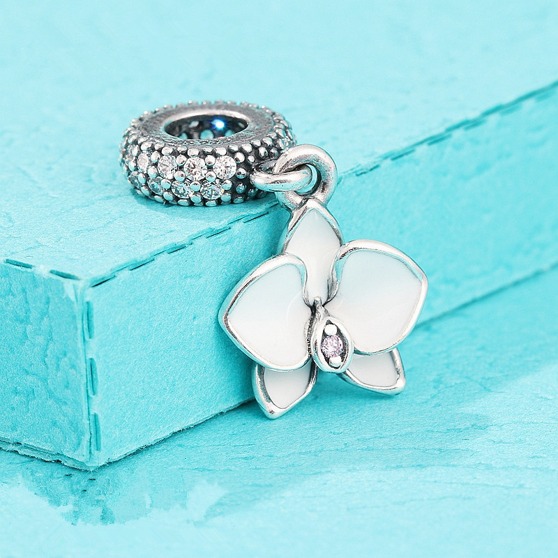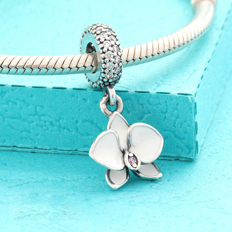 925 Sterling Silver Orchid, White Enamel Dangle Charm Bead