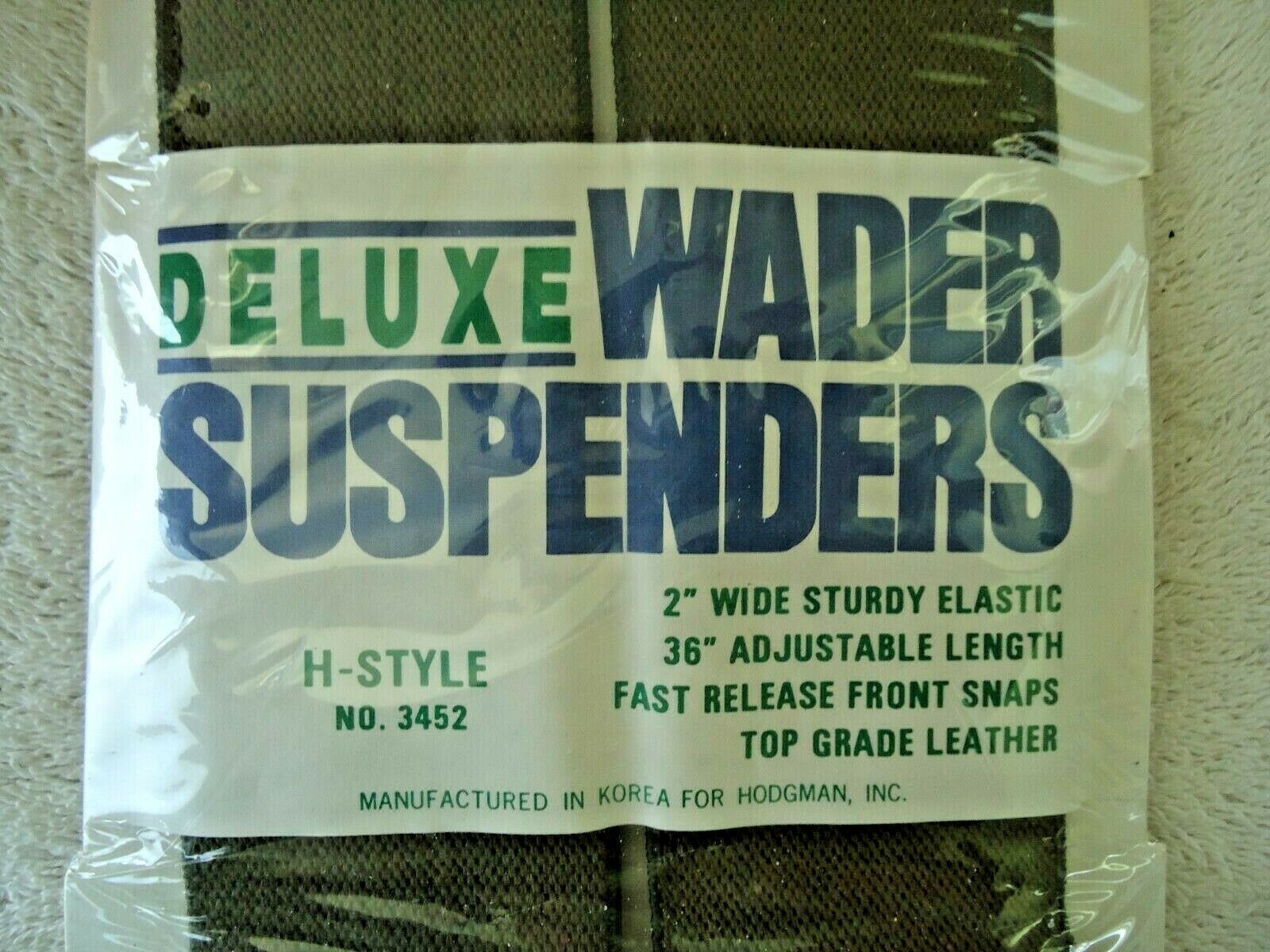 Here is a Vintage " NOS " Hodgman H Style No.3452 Deluxe 36" Adjustable Length Wader Suspenders " GREAT COLLECTIBLE ITEM ".This is a must for any collector,or decorator wanting that vintage retro look.If you have any concerns or questions about this item(s) please ask before bidding / purchasing because this item(s) is being SOLD AS IS.Thank You.-(PC127)