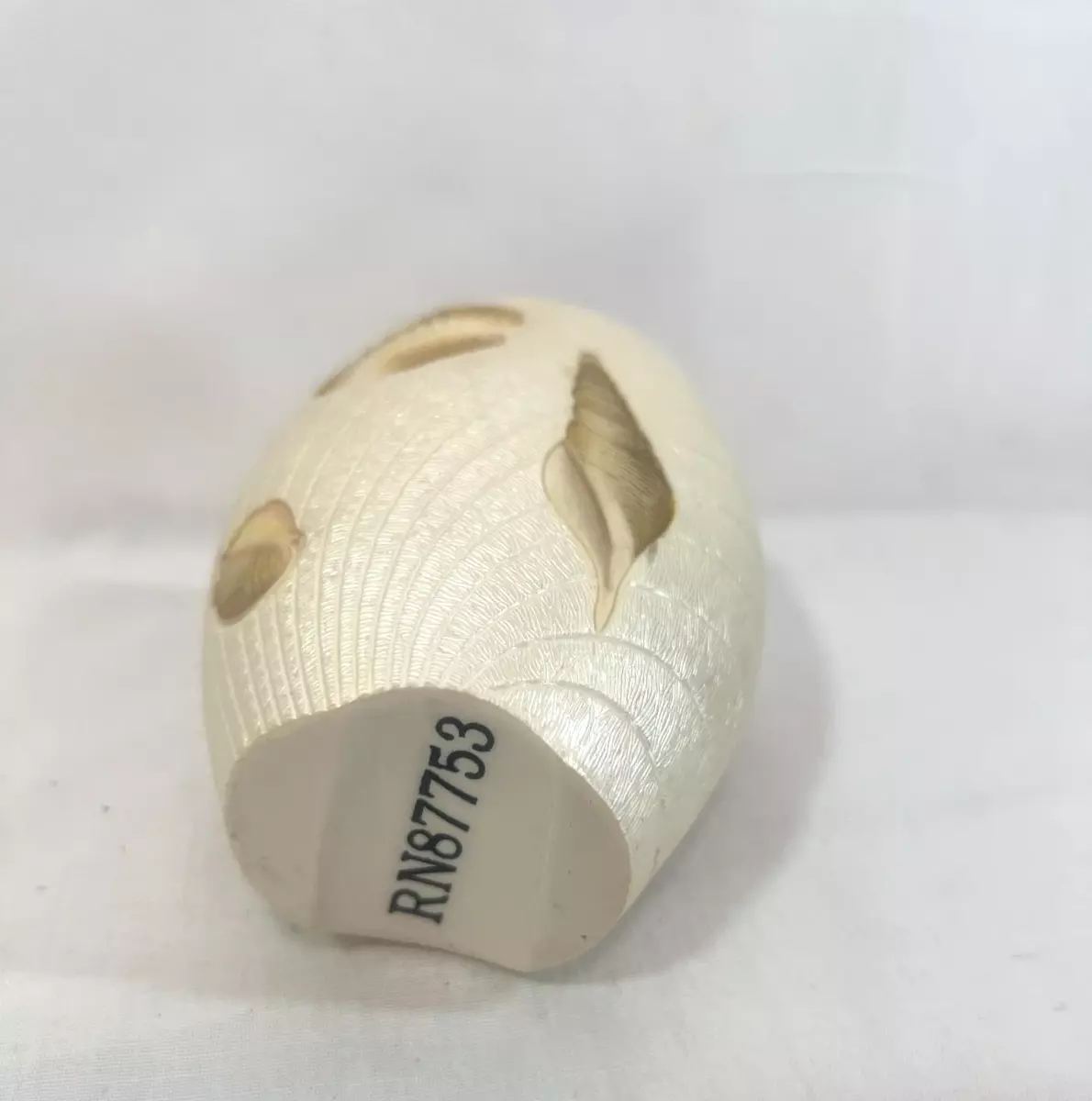 Embossed hand painted shells on off-white pearl base.