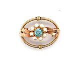 10k yellow gold pin with applied rose gold scrollwork featuring a genuine blue zircon gemstone and pearls. The blue zircon measures about 6.5mm round. The zircon has some abrasions and a chip on the pavillion. There are eight cultured pearls measuring about 4mm.
