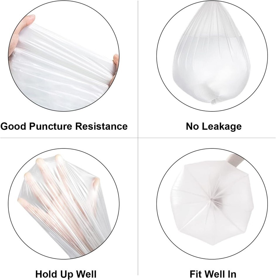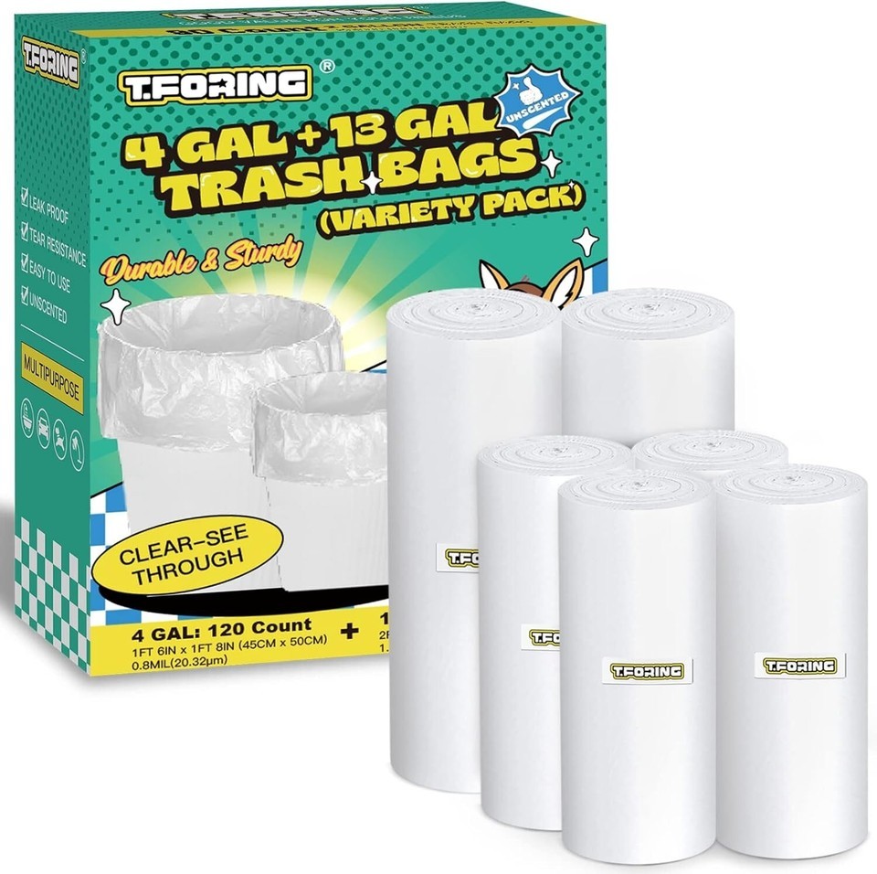 About this item ?CONVENIENT COMBO PACK?T.FORING offers a combination set of small and tall trash bags. This unique package includes 120 of 4 gallon garbage bags and 40 of 13 gallon trash bags. With this convenient combo, you'll have the right size bag for any waste disposal need. ? VERSATILE SOLUTION ?The 4 gallon trash bags, measuring 24.8" x 31.5", fit 12-15 liter trash cans, ideal for bathroom, bedroom and car. The 13 gallon garbage bags, measuring 21.65" x 26.77", fit 38-49 liter trash bins, and work for kitchen, office and outdoor. ?STRONG HOLD UP WELL?Made with premium HDPE materials, these trash can liners are thick, durable, and leak-proof. They can handle different types of waste without tearing or leaking, providing a reliable disposal solution. ?ODOR CONTROL NO SCENT?We understand the importance of maintaining a fresh and clean environment. So our transparent wastebasket bags are equipped with advanced odor-neutralizing technology to absorb and neutralize unpleasant smells.