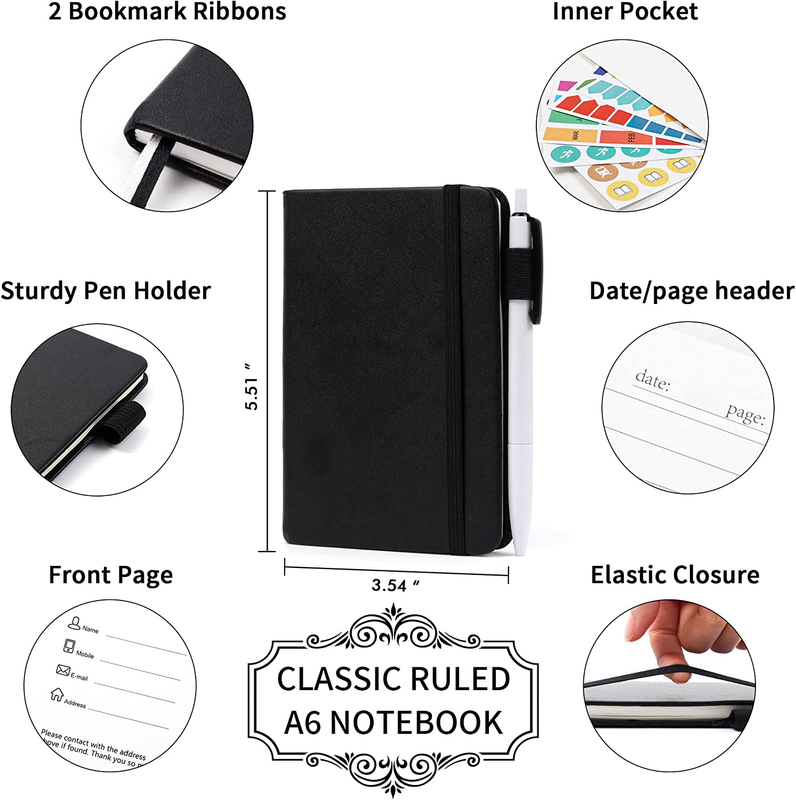 15 Pack Pocket Small Notebooks Bulk, Mini Cute Notepads Hardcover College Ruled Lined Journals with Pen Holder for School Business Memos, with 15 Black Pens, 3.5?X 5.5?, A6, Black