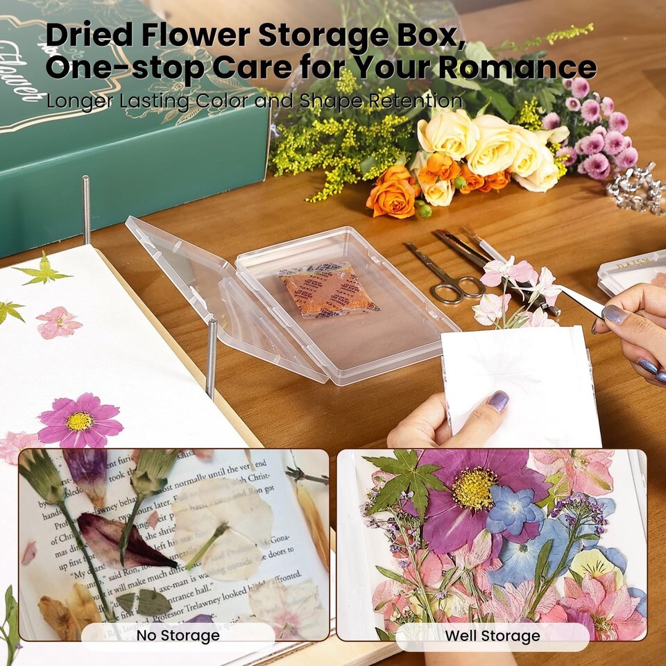 Complete Storage Package: The flower press kit specially contains 4 plastic storage boxes for sorting and storage of different kinds of dried press flowers. All-round care of dried flowers, maintain its dry state and bright color, one-stop to meet the needs of dried press flowers storage