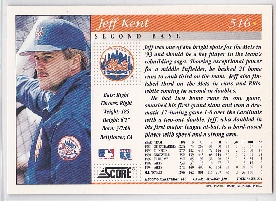 1994 Score Baseball Trading Card Jeff Kent #516 Card is in very good condition.