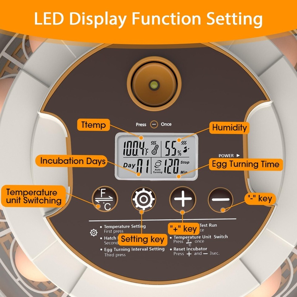 LED Display Temp Control: The egg incubator is equipped with an LED display that allows you to visualize data such as temperature. The incubator also features a temperature control that allows you to set the desired humidity level with the control buttons