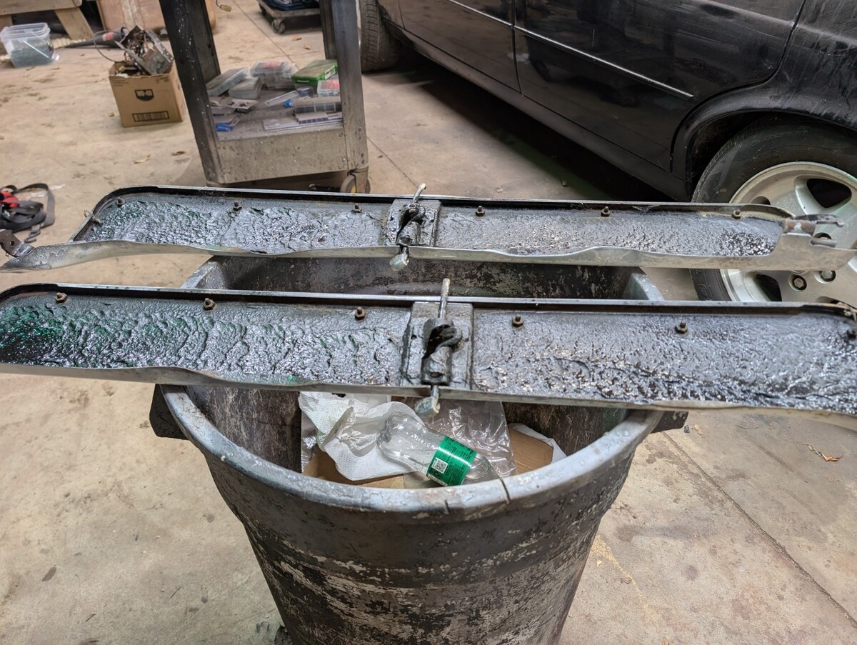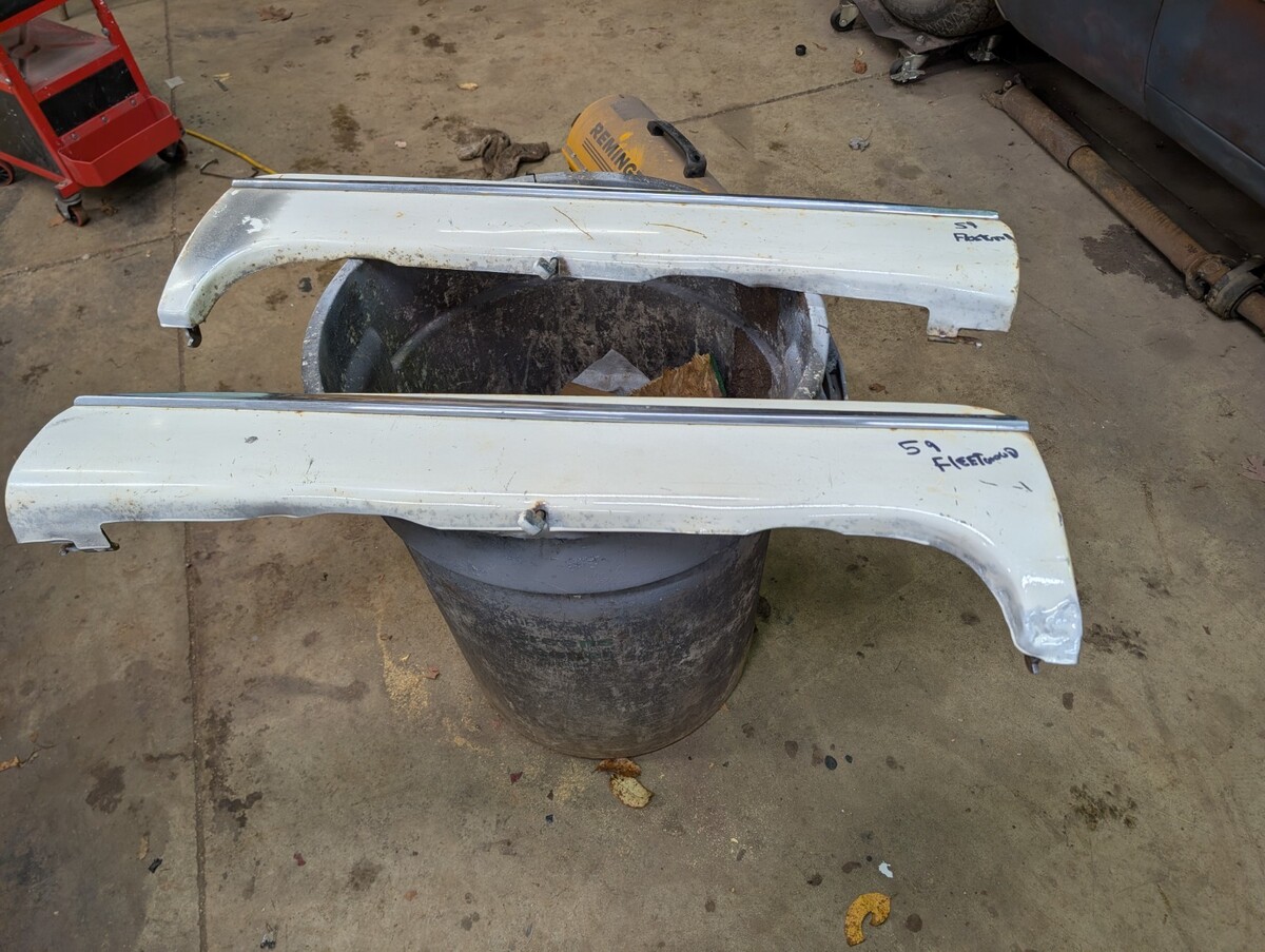 1959 Cadillac Fleetwood fender skirts. Little surface rust and dents. No rot. Undercoat on back sides but no rot underneath. Free shipping in continental USA