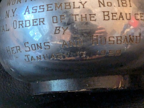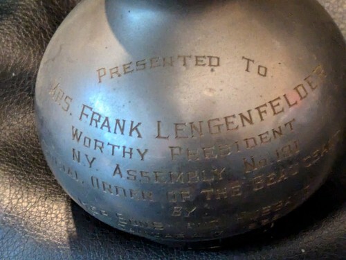 Questo storico martelletto, che misura 9 pollici di altezza, e una scoperta rara per qualsiasi appassionato di organizzazioni massoniche o fraterne. Realizzato negli Stati Uniti nel 1959, presenta incisioni intricate ed e un pezzo unico di cimelio storico. Il martelletto e perfetto per chi cerca di aggiungere un tocco di nostalgia alla propria collezione o per chi apprezza la storia della Massoneria. Con le sue categorie di organizzazione massonica e organizzazioni fraterne, questo oggetto da collezione e un must per ogni collezionista serio. Inciso: Presentato a La signora Frank Lengenfelder Degno Presidente Assemblea di New York n. 181 Ordine sociale del BeauCeant Di I suoi figli e il marito 17 gennaio 1959