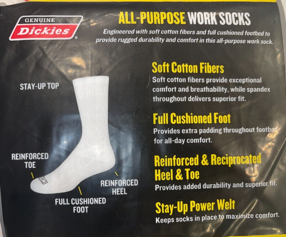 WE BUY DIRECTLY FROM DICKIES, SO YOU GET A FRESH BATCH OF SOCKS DIRECTLY FROM DICKIES, YOU DON'T HAVE TO WORRY ABOUT THESE SOCKS BEING IN TRUCKS OR WAREHOUSES OR RETAIL STORES WHERE THOUSANDS OF PEOPLE TOUCH THEM ON DAILY BASIS. EACH PAIR OF SOCKS ARE FRESH FROM THE FACTORY AND NOT SITTING IN A WAREHOUSE FOR MONTHS AT A TIME. PLEASE MAKE SURE YOU PICK THE RIGHT SIZE AS WE DO NOT ACCEPT RETURNS ON SOCKS AND UNDERWEAR, WE WILL NEVER SELL OR RE-SELL ANY ITEM THAT TOUCHES A PERSON'S FOOT. THIS POLICY IS TO PROTECT CUSTOMERS FROM RECEIVING TAINTED ITEMS.