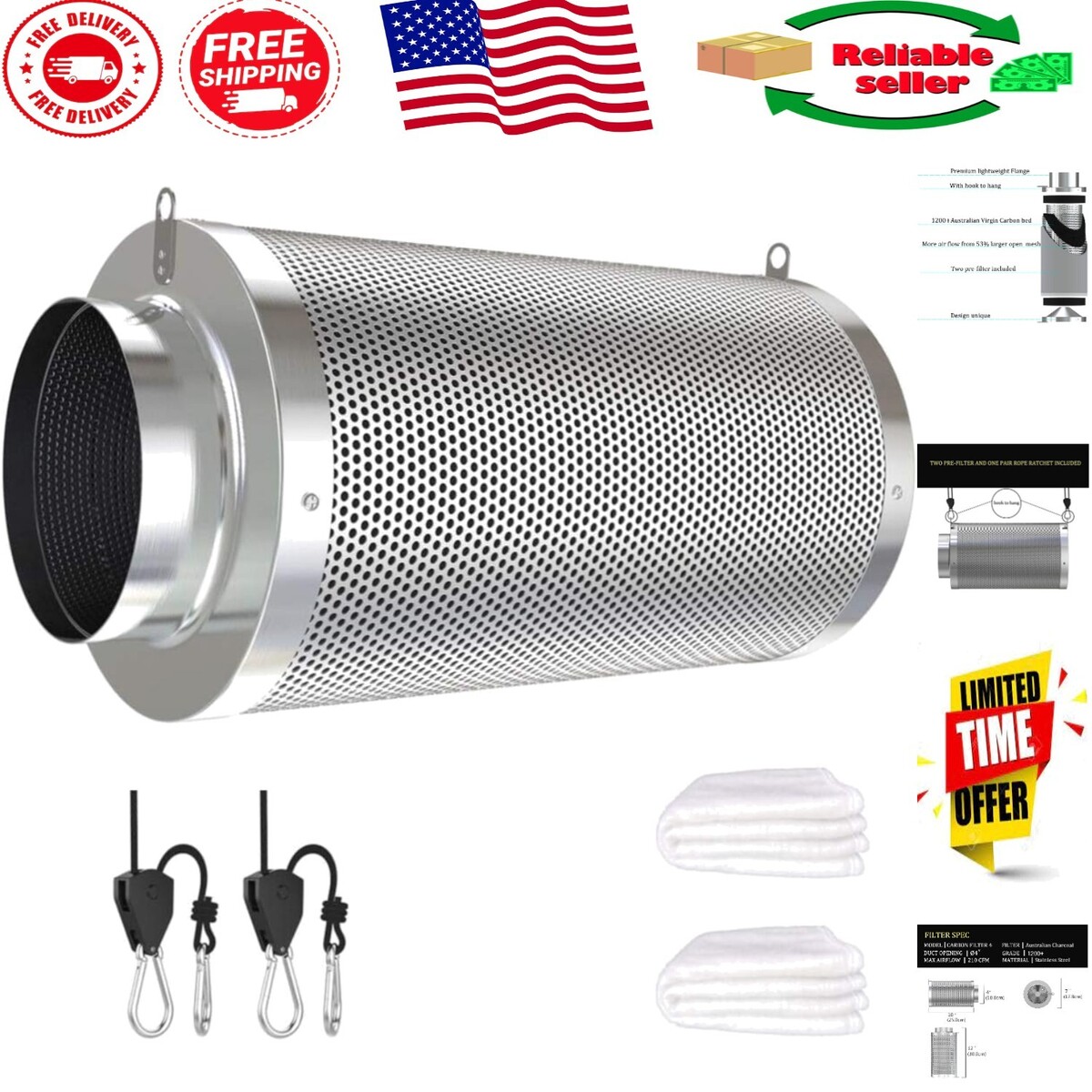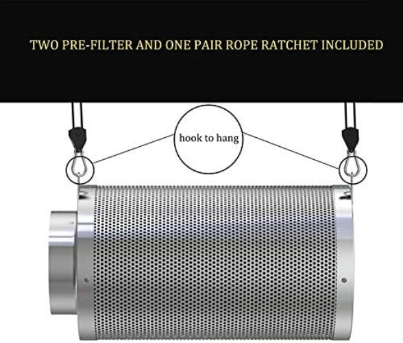 Package includes: 4inch Carbon Filter, 2 free Pre-Filters, and 1 pair of heavy-duty stainless steel rope hangers.