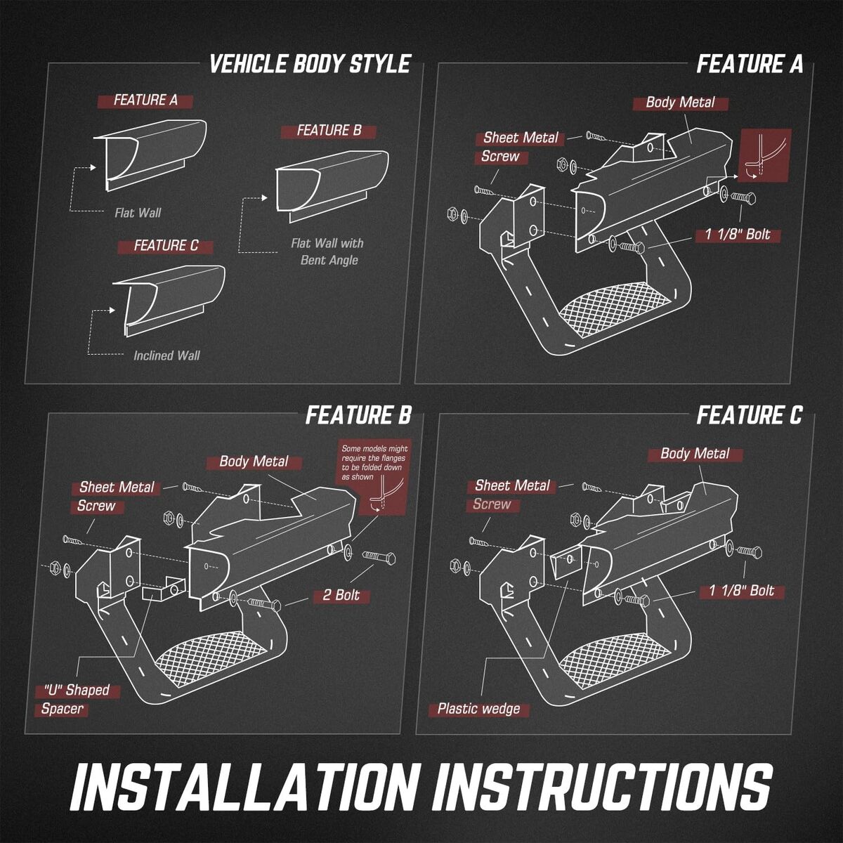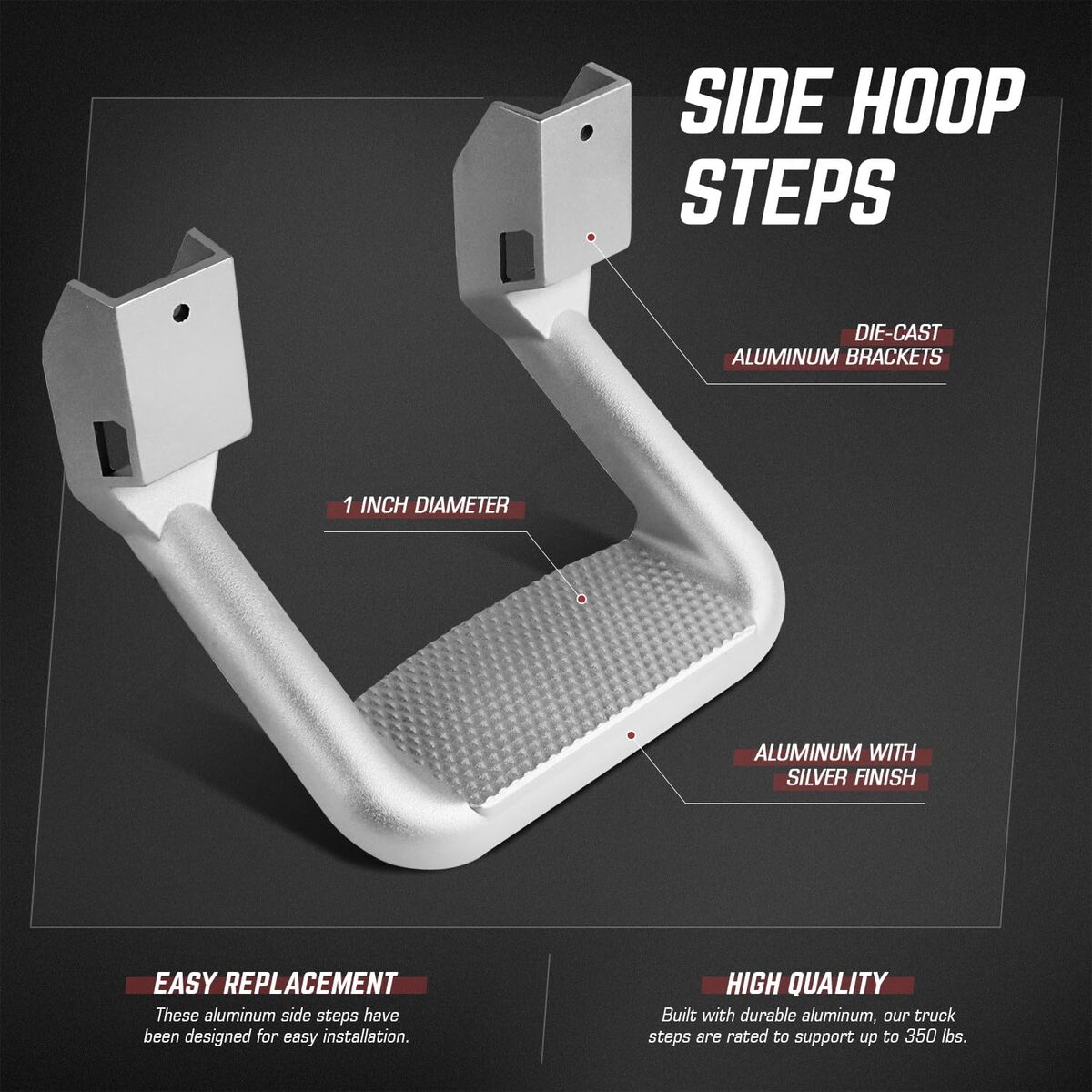 ?Feature?Die-cast Aluminum Brackets with Non-slip Step Surface. 1 Inch Diameter Stirrup Side Steps for Safe and Convenient Access to Your Vehicle.