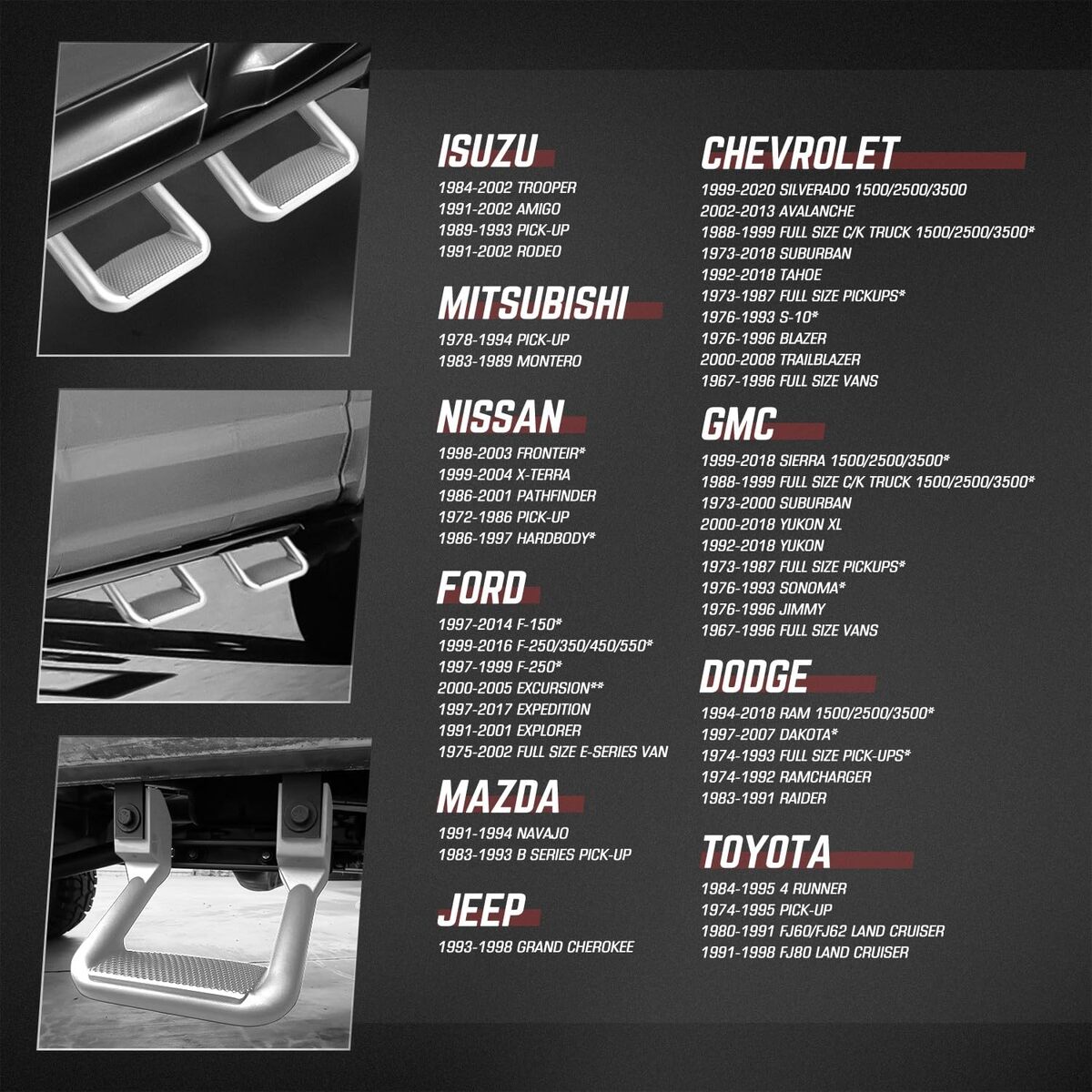 ?Fitment?Universal Side Steps For Automotive Aftermarket. Compatible with Pickup Truck SUV Models From Isuzu, Mitsubishi, Nissan, Ford, Mazda, Jeep, Chevy, GMC, Dodge, Toyota. Please Confirm The Compatibility For Your Vehicle Before Purchase.
