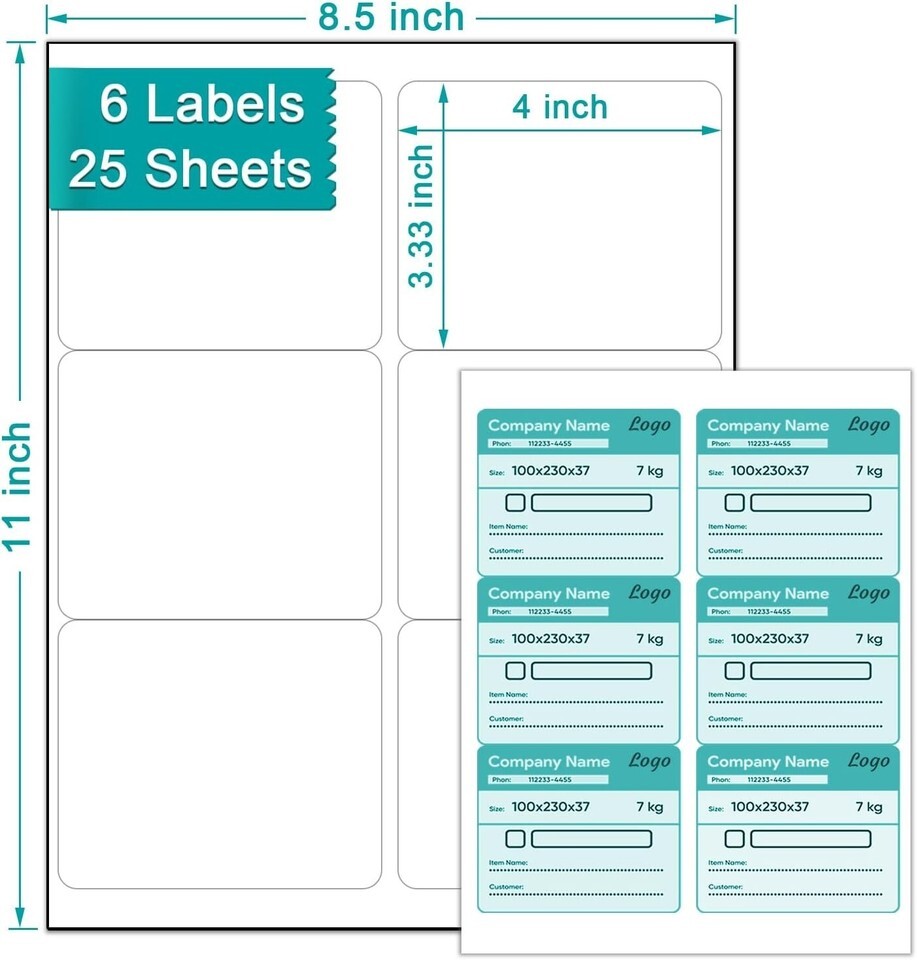 3.33x4 in Labels - 25 Sheets 6 Label Stickers Paper for Inkjet/Laser Printer 150