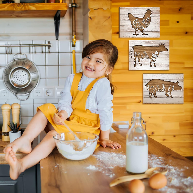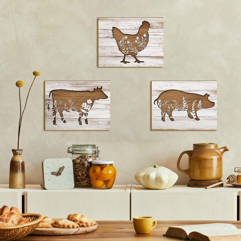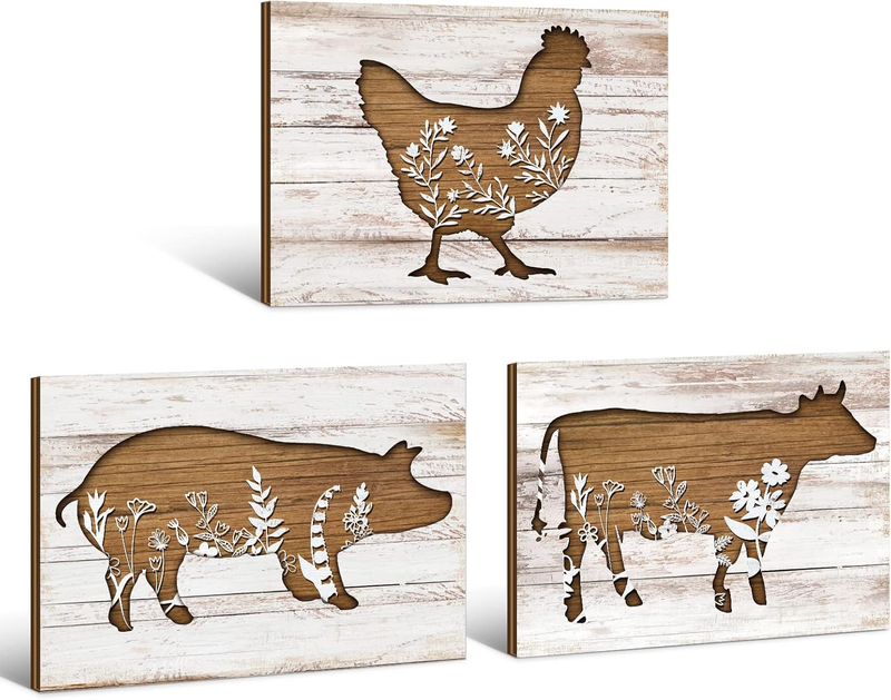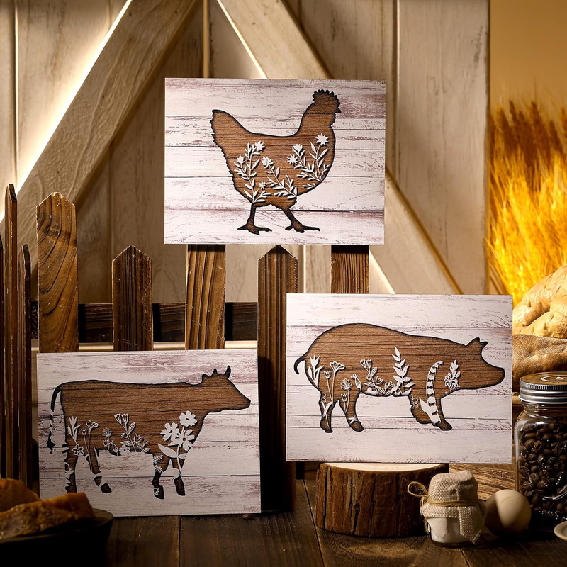 What you will receive: you will receive 3 pieces of farmhouse kitchen signs, including cow, rooster and pig decors in 7.9 x 5.9 inch; Rustic wooden signs can help you create a warm atmosphere for your home