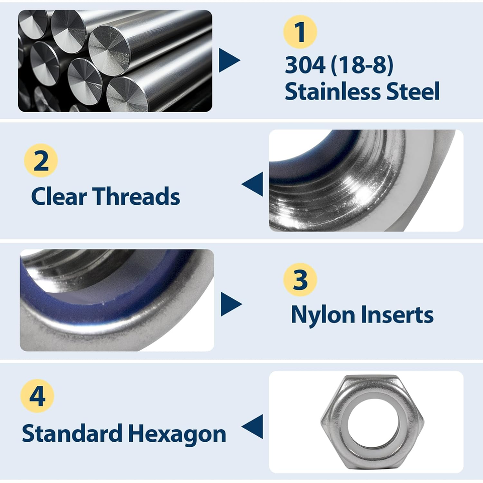 Made from 304 stainless steel (18-8), these locknuts are built to last. They offer excellent corrosion resistance and durability, outperforming galvanized options for a longer service life, especially in demanding environments.