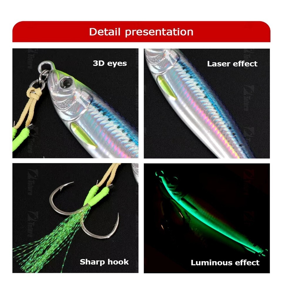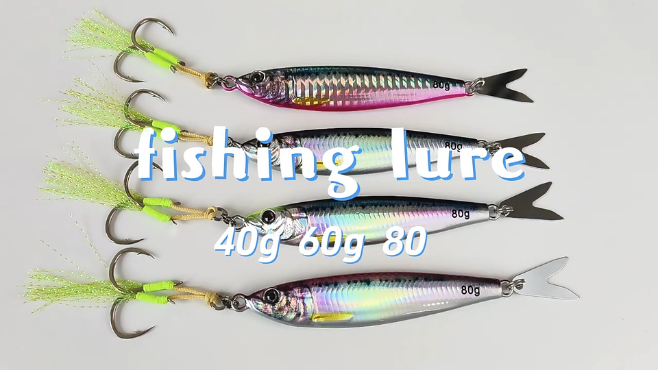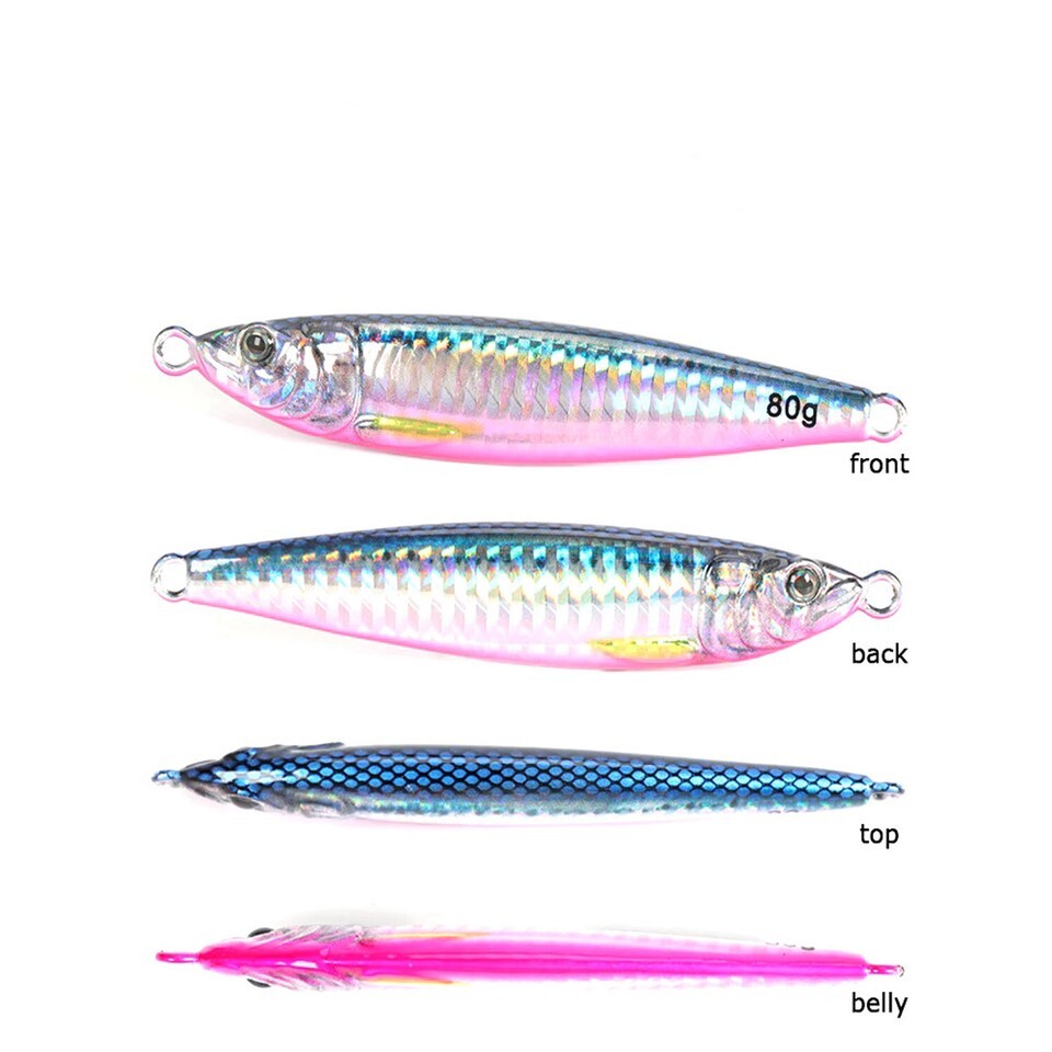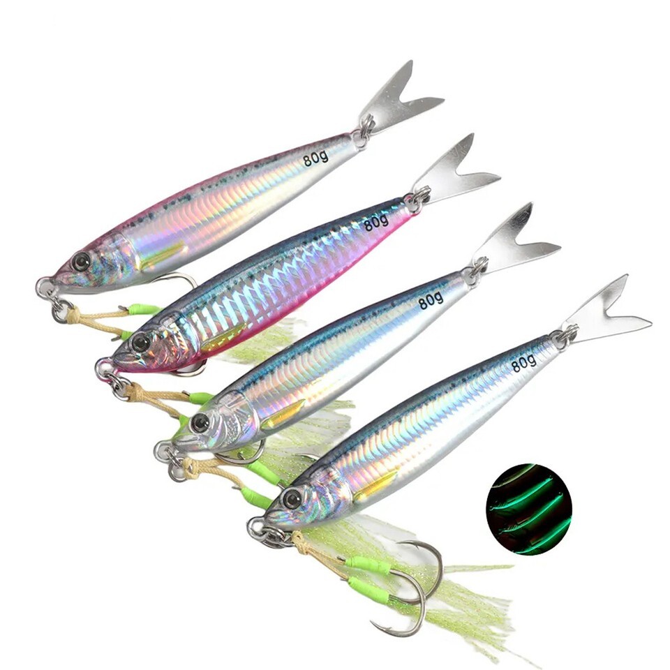 - High Quality 80g Luminous Long Throw Jigging Bait Fishing Lures metal Fishing Lure With sequins - 3D life like fish eyes provides excellent appearance of continuous metal flash and luminous effect to attract fishes. - 4pcs jigging lures set comes in 4 slightly different colors