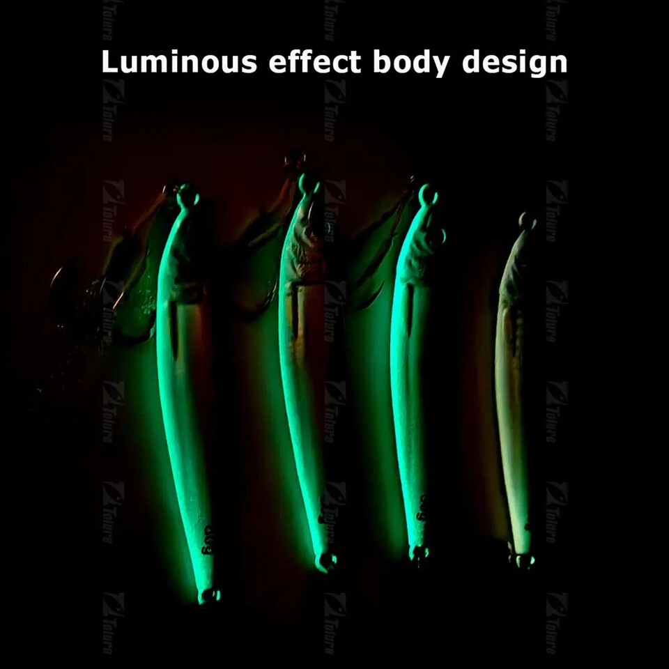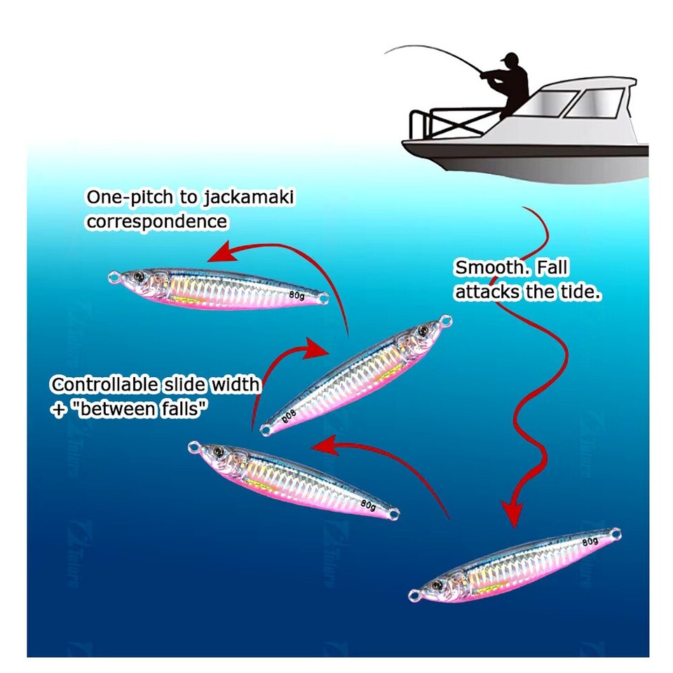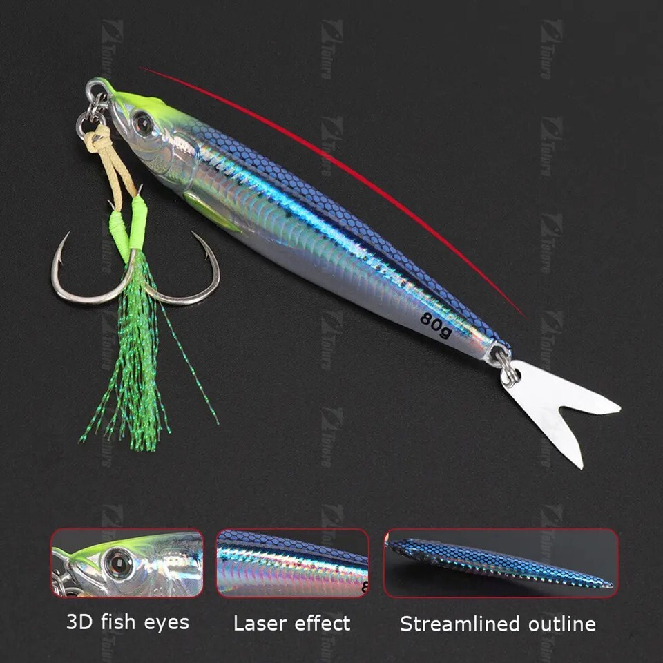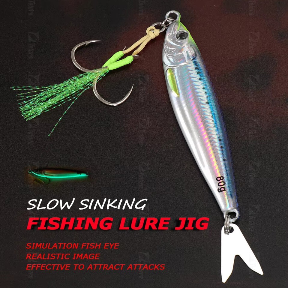 - High Quality 80g Luminous Long Throw Jigging Bait Fishing Lures metal Fishing Lure With sequins - 3D life like fish eyes provides excellent appearance of continuous metal flash and luminous effect to attract fishes. - 4pcs jigging lures set comes in 4 slightly different colors