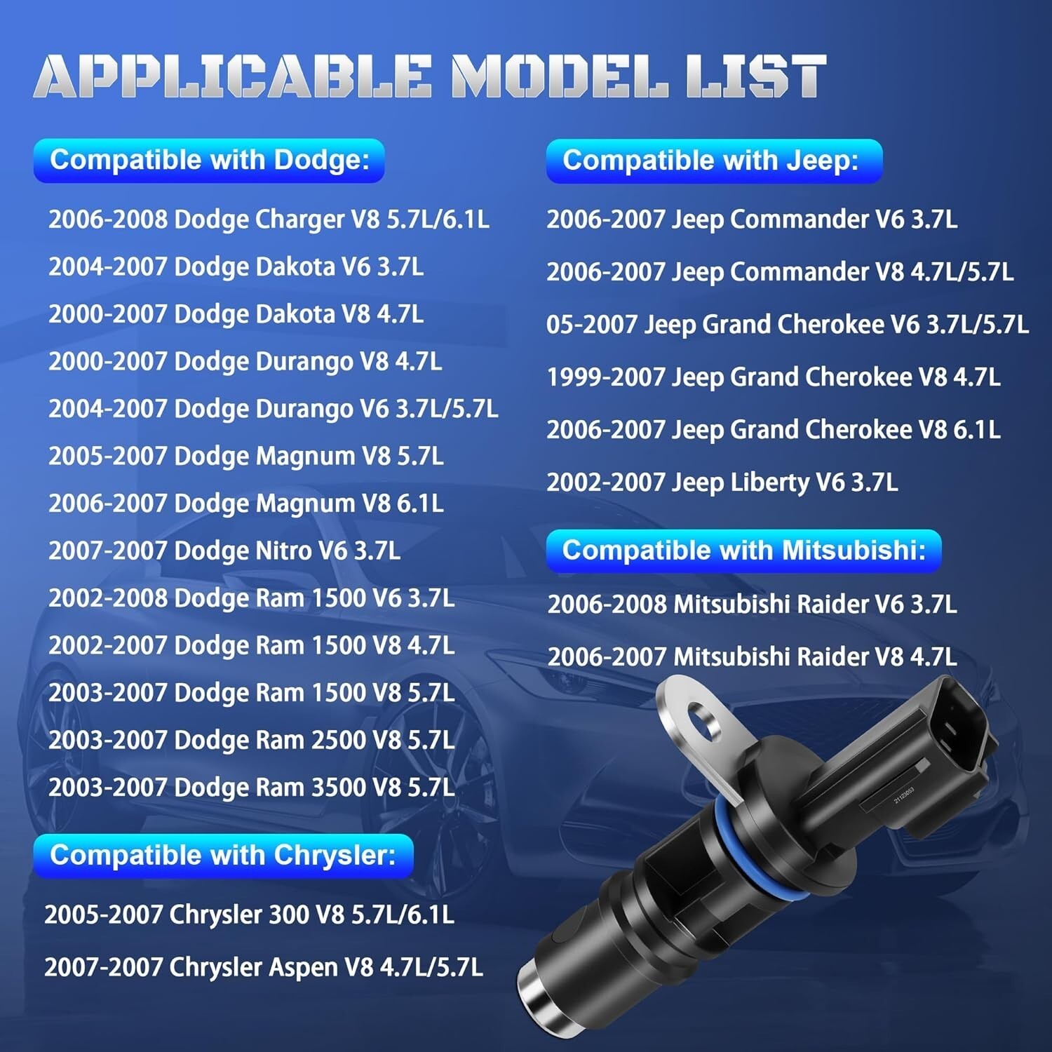 The camsahft position sensor compatible with Jeep Grand Cherokee 4.7 1999 2000 2001 2002 2003 2004 2005 2006 2007, Jeep Liberty 2002 2003 2004 2005 2006 2007, Jeep Commander 2006-2007 | Cam sensor for Chrysler 300 2005-2007, Chrysler Aspen 2007 | Mitsubishi Raider 2006-2008. More model details, please refer to the image and description