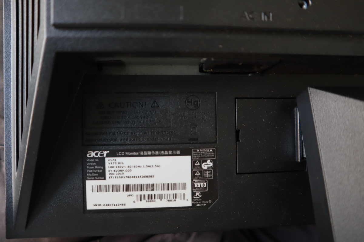 - Acer V173 17" LCD VGA Monitor 1280x1024 Resolution 4:3 w/Stand-VGA & Power Cord