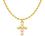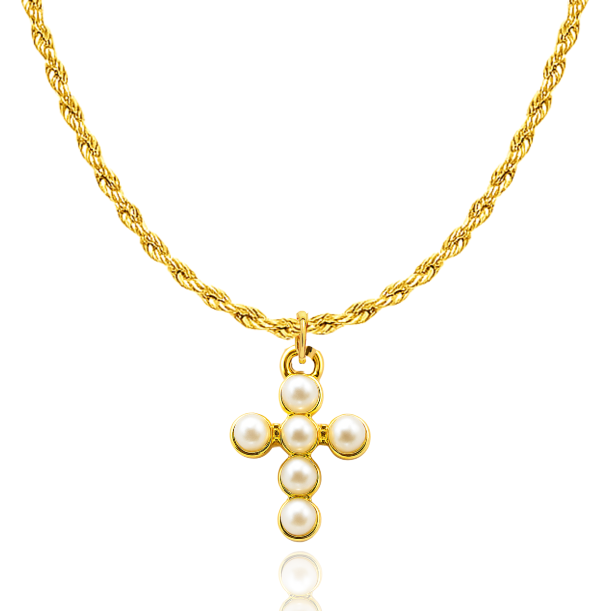 This is a beautiful gold, cross shaped necklace with synthetic pearls embedded within the cross. Such a unique but beautiful way to show your faith. Perfect for everyday wear and can match any outfit.