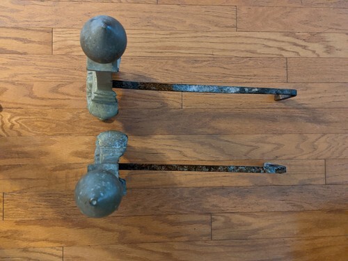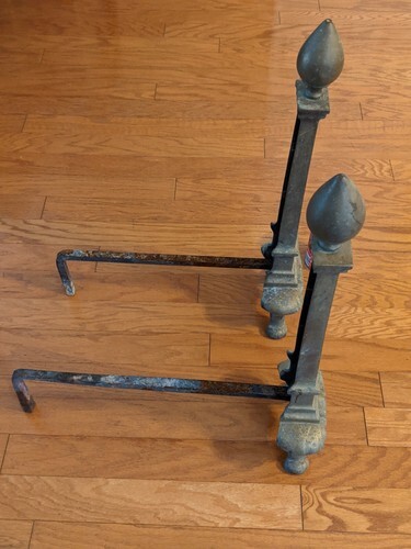 In vendita c'e una coppia usata di alari in stile federale greco con colonna in ottone pesante decorato antico alti 26 pollici.