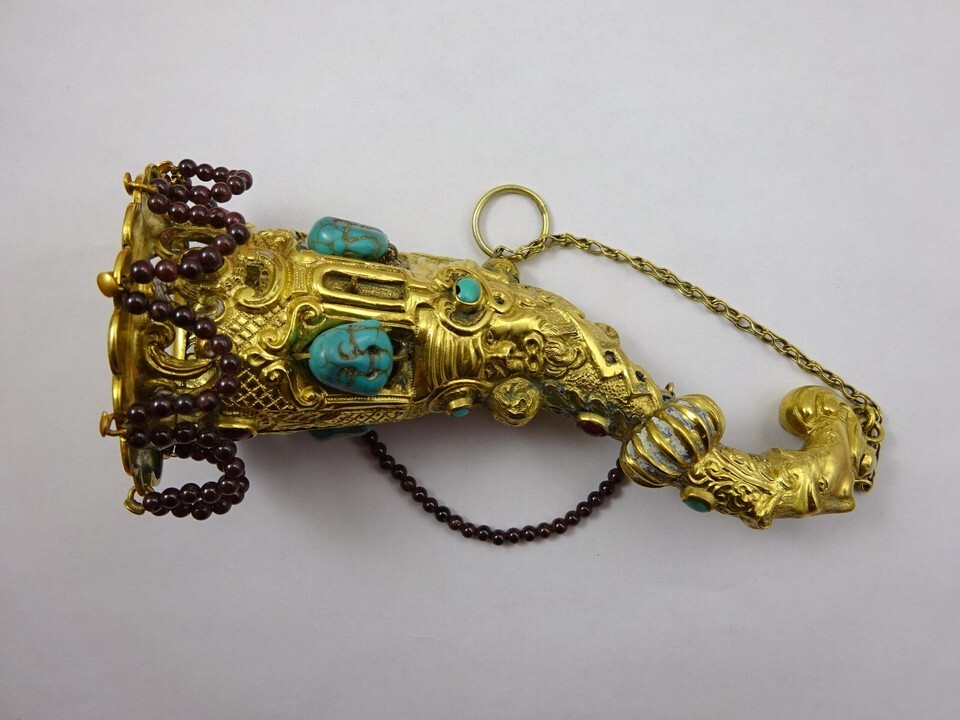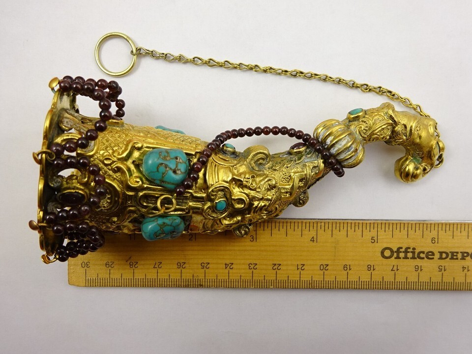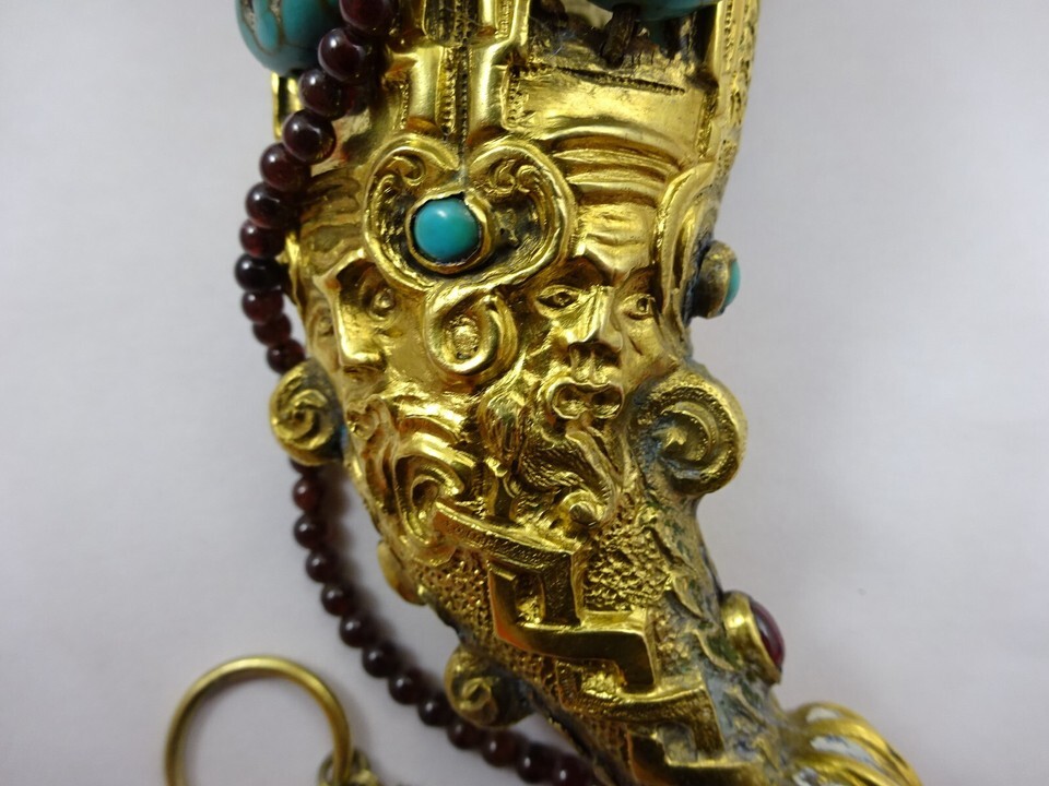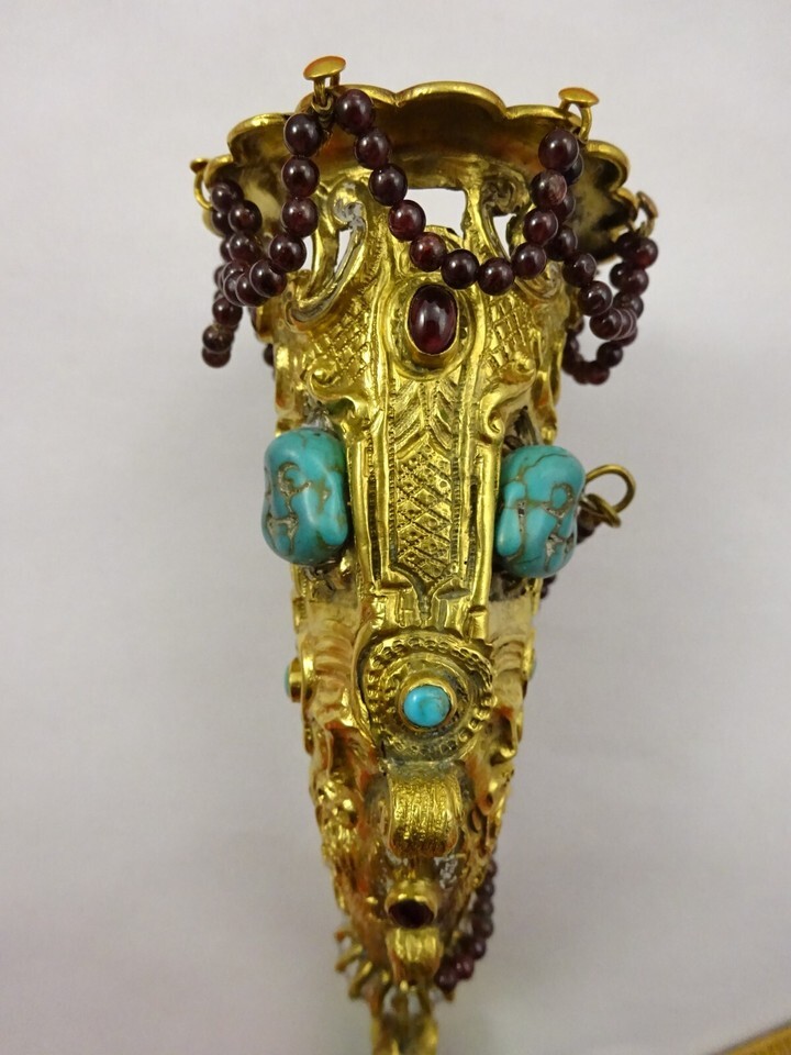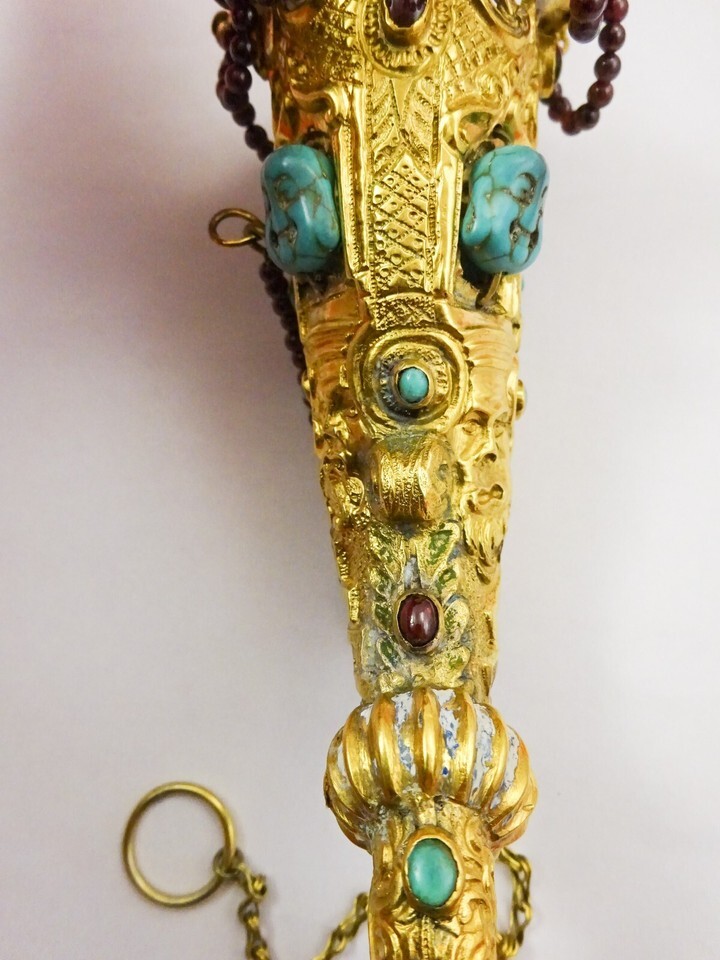 Stunning Asian or Indian silver gilt tussie with garnets and turquoise. The handle is the form of a face with a white cabochon stone in the mouth. There are four faces on sides of the tussie. There are four larger carved turquoise heads and five smaller turquoise cabochons. (Note: One of the small stones is chipped).
