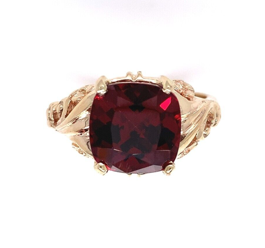 10k yellow gold ring set with a square cushion cut garnet weighing 1.68