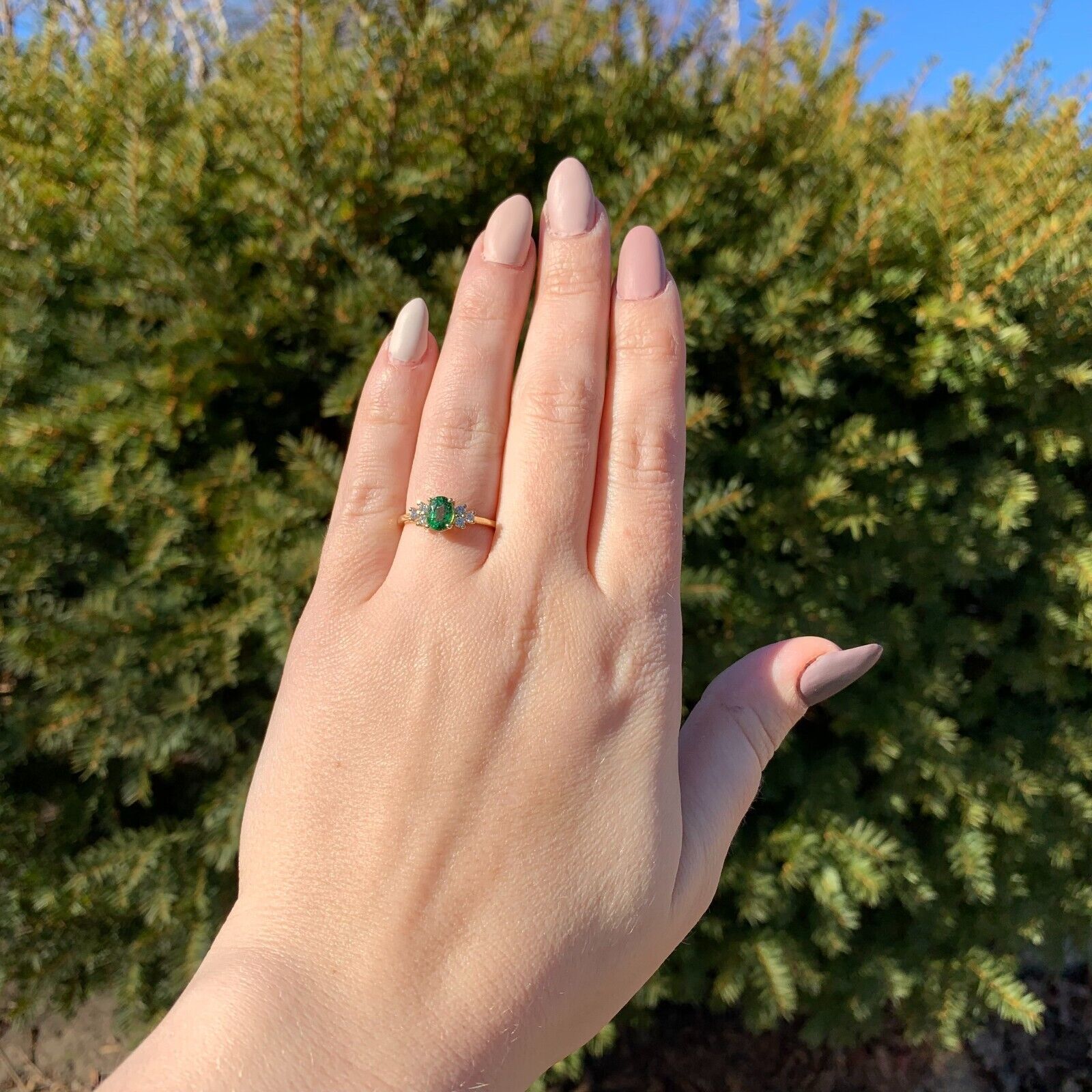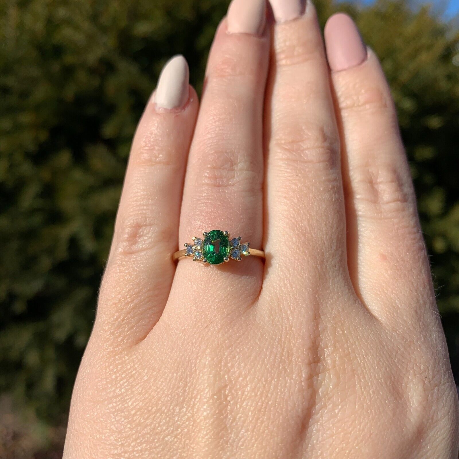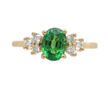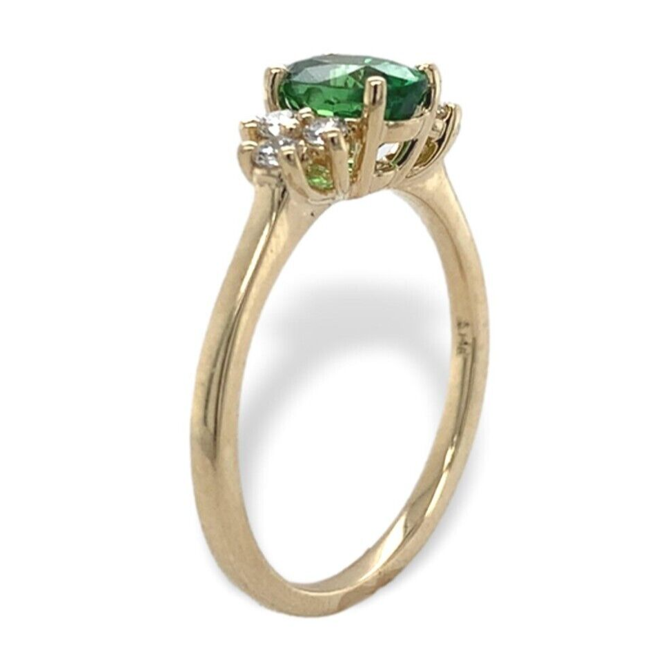 14k yellow gold tsavorite green garnet and diamond ring. The tsavorite is a bright grass green color and weighs 1.11 carats. The oval stone measures about 6.7mm x 4.8mm. There are six round brilliant cut diamond accents measuring about 2mm and weighing .14cts total.