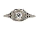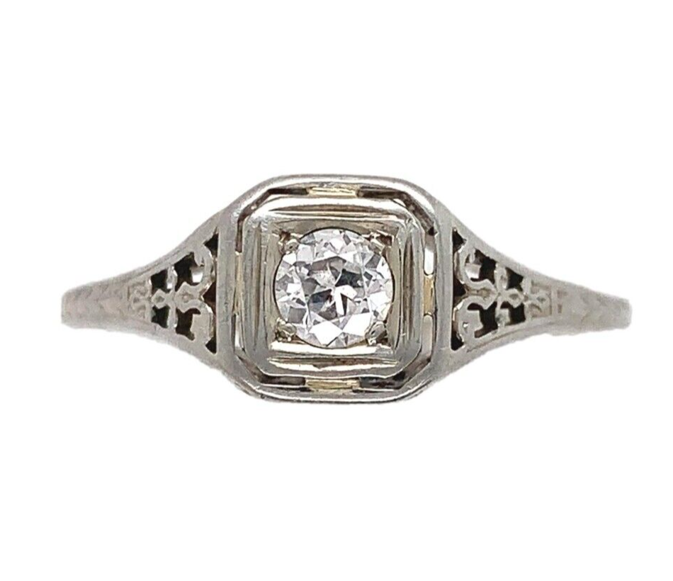 18k white gold filigree ring featuring a European cut diamond weighing about .15cts. The diamond has I1 clarity and H-I color. It measures about 3.3mm. The ring fits a size 7.75 finger, and weighs 1.37 dwt. It dates from the 1920s. Beautiful!