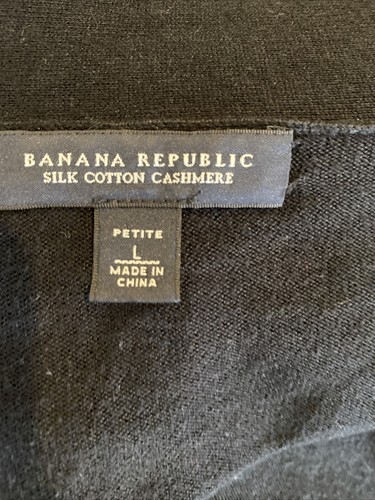 Banana Republic Tie Front Cardigan Women's Size Large Black Measurements: Underarm to Underarm - 23" Shoulder to Hem - 29" Materials: 55% Silk, 40% Cotton, 5% Cashmere Hand Wash Cold Dry Flat Gently Worn in Very Good Condition See all Photos. Check out my other items. I am happy to combine shipping and only charge actual shipping charges! My goal is always 100% complete customer satisfaction. If you feel your item has arrived "not as described", please contact me to arrange for return/refund before leaving feedback I am a trading assistant. I can sell your items for you! |KES-STO|