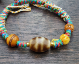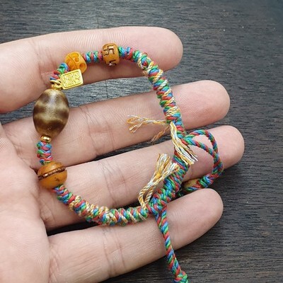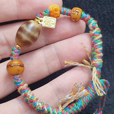 Le bracelet de perles Dzi fait a la main presente un cordon multicolore et des perles spirituelles, originaires du Tibet. Fabrique avec de l'agate comme materiau principal, ce bracelet original vintage reflete une histoire riche et une signification culturelle. Fabrique avec soin et attention aux details, ce bracelet est une piece unique et belle qui incarne l'artisanat tibetain traditionnel.