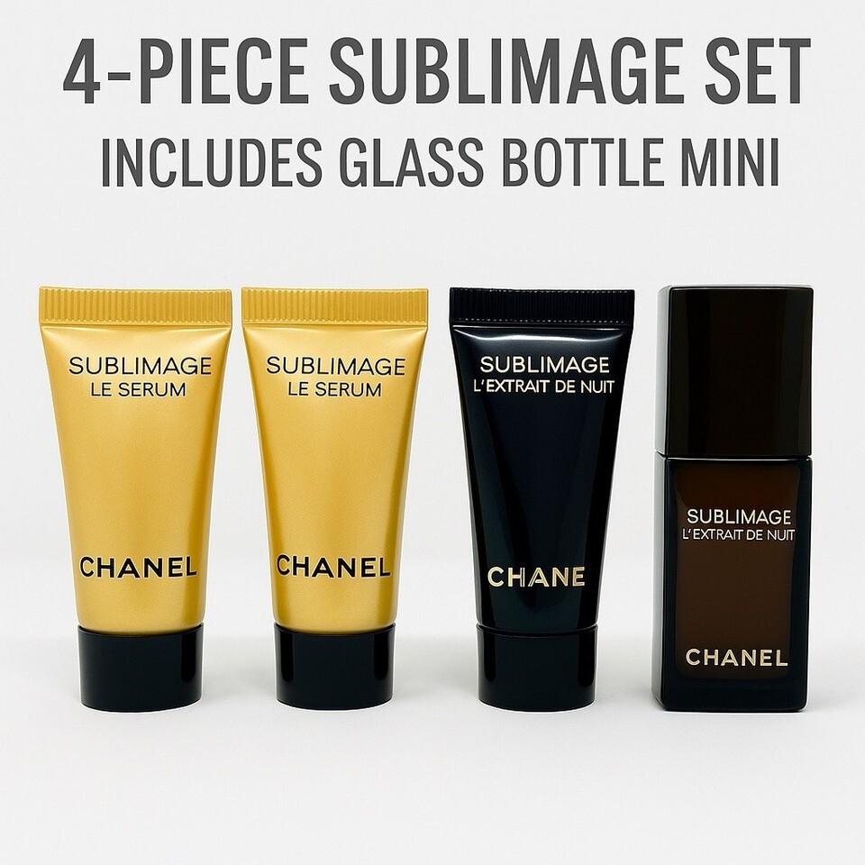 A luxury 4-piece CHANEL Sublimage bundle anchored by two L?Extrait de Nuit night concentrates (one glass bottle premium mini and one tube), plus two Sublimage treatment minis. Ideal for travel, gifting, or sampling the line before committing to full size.