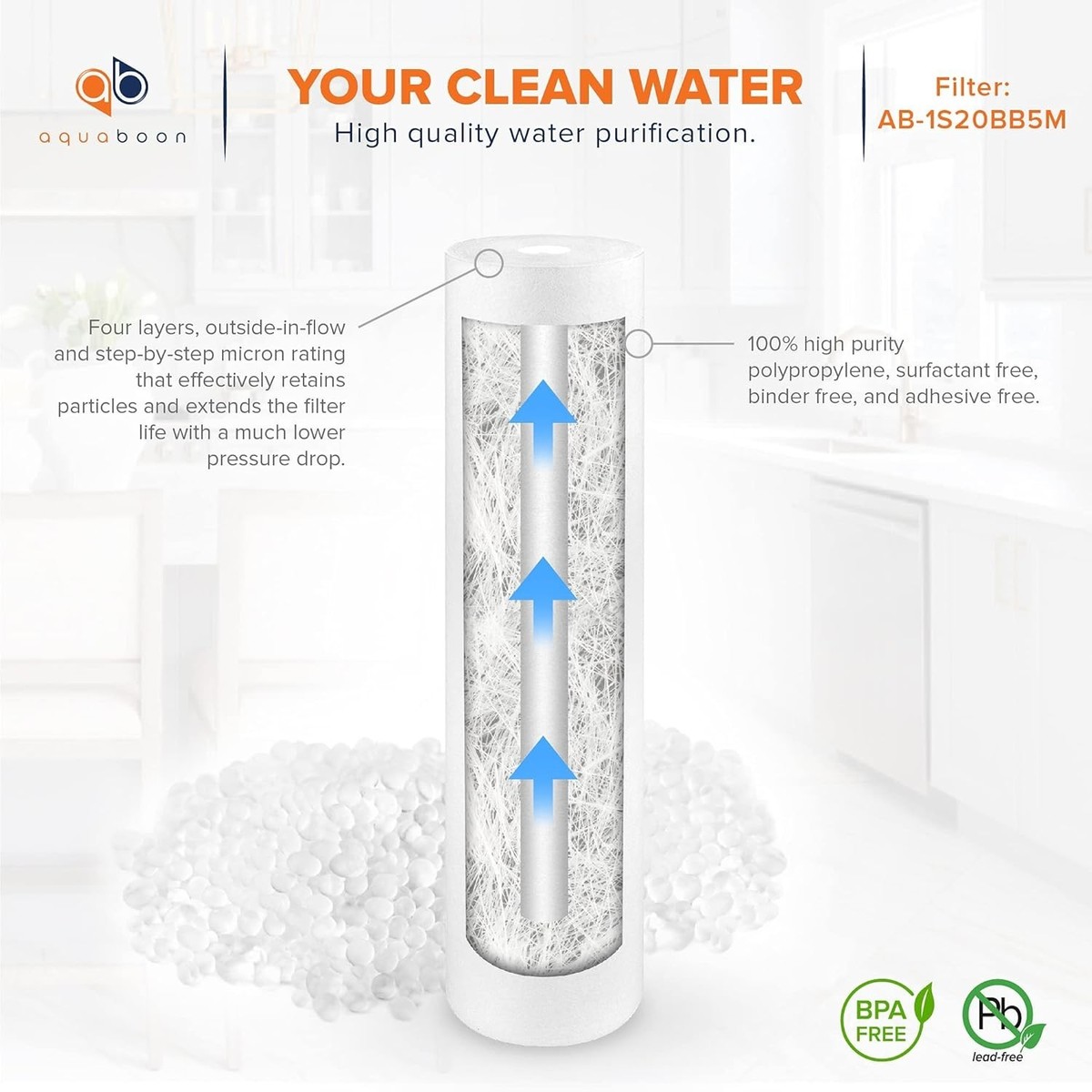 Aquaboon 5 Micron 20 x 4.5 Water Filter Cartridges Set of 4, Whole House Water Filter Replacements for 2-Stage Sediment Chlorine, Odors Reduction