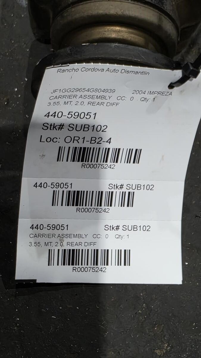 Welcome to our Store! Carrier Differential Rear 2.0L Manual Transmission 3.55 Ratio 02-05 WRX 75242 Description Donor Vehicle VIN: JF1GG29654G804939 Model: IMPREZA Year: 2004 Mileage: 0 (0 = not available or unknown) Stock Number: SUB102 Store Number: 1 Part Detail Part Grade: Part Category: U Part Placement: Notes: 3.55, MT, 2.0, REAR DIFF SJIPPING TO A COMMERCIAL ADDRESS ONLY!!! This part will fit these makes and models with these options IMPREZA 02-03 Rear; 2.0L, MT (3.55 ratio) IMPREZA 04 Rear, 2.0L, MT (3.55 ratio) IMPREZA 05 Rear; 2.0L, MT (3.55 ratio) SAAB 9-2X 05 Rear; w/viscous (limited slip differential), (2.0L), MT (3.545 ratio) WARRANTY / GUARANTEE Return Policy All parts we sell come with a 30 Day Money Back Guarantee unless otherwise stated. The 30 day period starts when you take possession of the part. Please contact us through messaging for a Return Merchandise Authorization Number (RMA) before returning any part. We do not cover the cost of labor charges during the installation of your parts. All original shipping costs are non-refundable. Standard Warranty We offer a standard warranty on all mechanical parts. This covers the part only, no labor charges to install the part. We are not responsible for any improper installation or misdiagnosis. SHIPPING NOTES ABOUT US HELP Rancho Cordova Auto Dismantling ships to US addresses within the continental 48 states. Shipping to Alaska, Hawaii, Puerto Rico, APO, FPO or PO Box addresses is available for select parts only. Please contact us through messaging for details and shipping rates. Local Pick-up at our facilities is available. Please contact us prior to your purchase to arrange local pick-up. Buyer must select 'Buy It Now' prior to local pick-up. Please allow up to 10 days for delivery unless your part is included in's Guaranteed Delivery Program. Most areas in the US are within 5 days. If an item arrives damaged, please contact us via messaging within 24 hours for assistance. Please contact us prior to purchasing this part if you have any questions regarding our business policies, the warranties or guaranties we offer or the fitment of this part with your vehicle. We strive to make sure your vehicles repair needs are met the first time you order a part through our store . To do so, we are happy to verify your vehicles VIN number prior to your purchase, please use the Contact Seller feature within the listing. Parts Grading. A standard code system is used to communicate the condition and quality of a part between automotive recyclers, automotive repair shops, and insurers. Knowing how these codes are used will help you understand whether the part meets your expectations before you buy it and what you can expect from the part when you receive it. A Grade - The highest quality part. It is of low miles and/or exceptional condition for its age. B Grade - The second level quality part. It is of average miles and normal condition for its age. C Grade - The third level quality part. It has high miles and/or light damage. No Grade - A part that has not yet been graded.