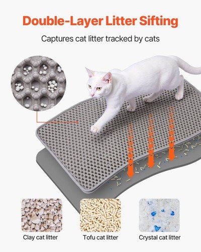 The cat litter box mat features large honeycomb holes that capture most types of litter, including tofu, clumping, bentonite, mineral, and crystal litters.