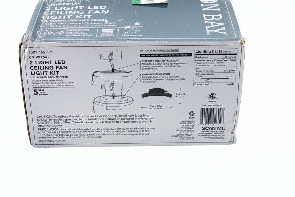 The Ceiling Fan Light Kit by Hampton Bay is a 2-light LED light kit designed for indoor use. It features a pull chain control style and a Sensor Type of Light. The kit comes in an oil-rubbed bronze finish, adding a touch of elegance to any room. With its brown color and high-quality construction from the trusted brand Hampton Bay, this ceiling fan light kit is a stylish and functional addition to any home.