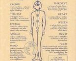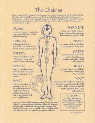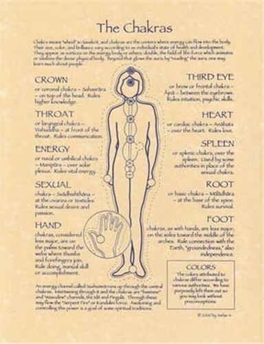 Chakra means wheel in sanskrit, and Chakras are the centers where energy can flow into the body. This poster depicts and defines them.