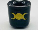 Perfect little ceramic chime candle holder with the symbol of the triple moon on the front in gold. A glossy black glazed holder that fits 1/2 inch diameter chime candles.Candle not included.