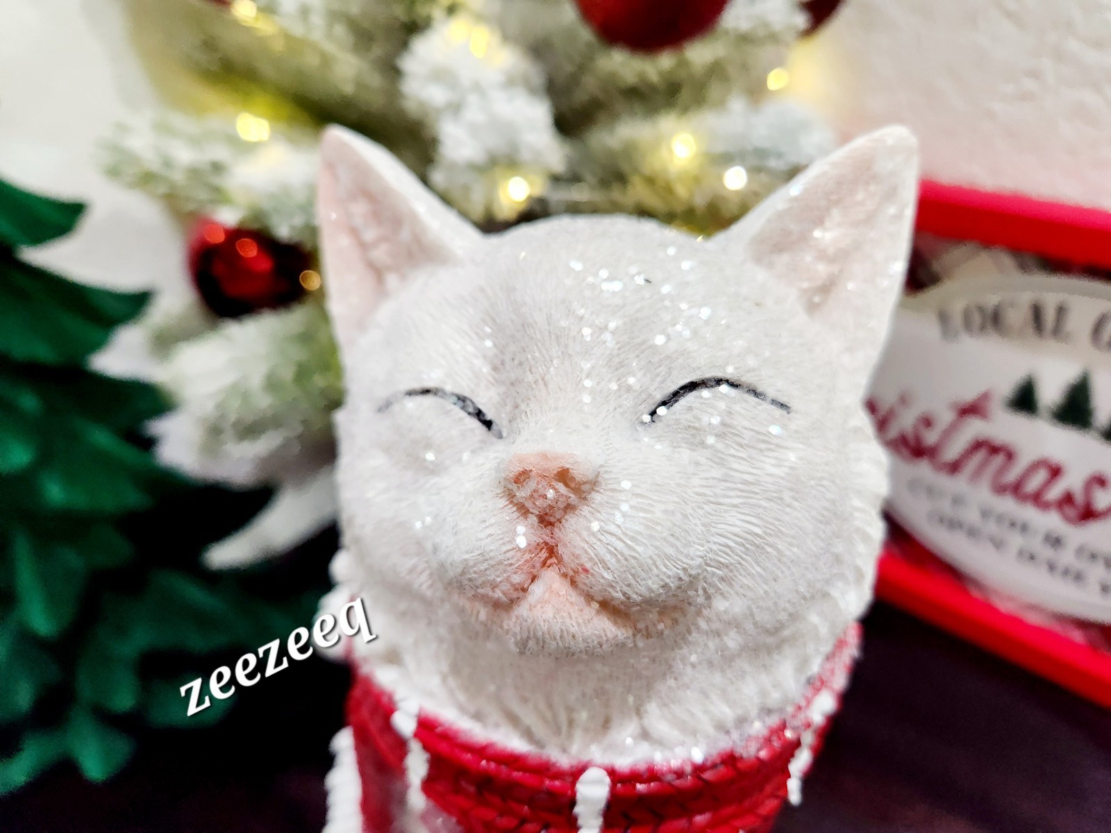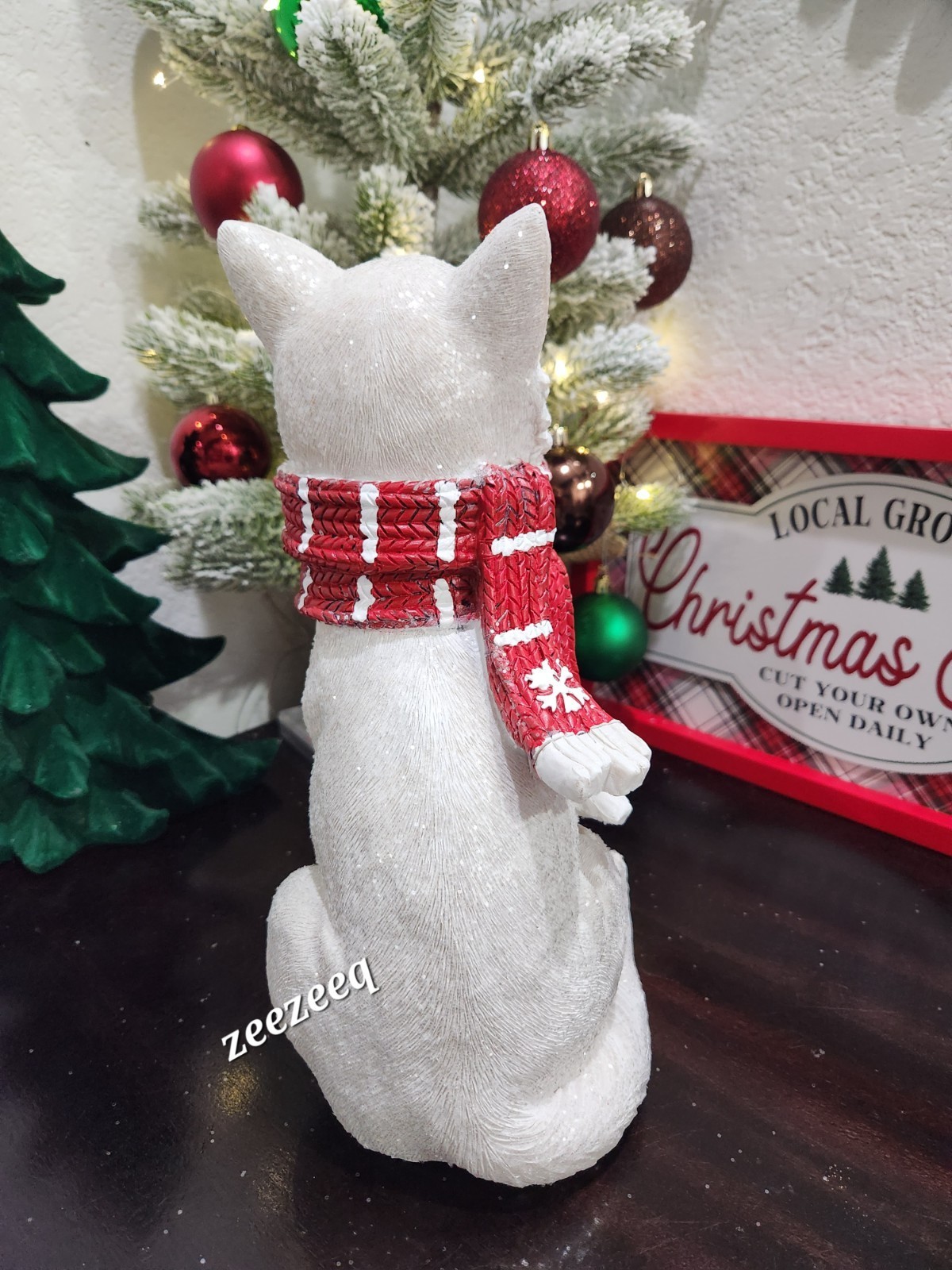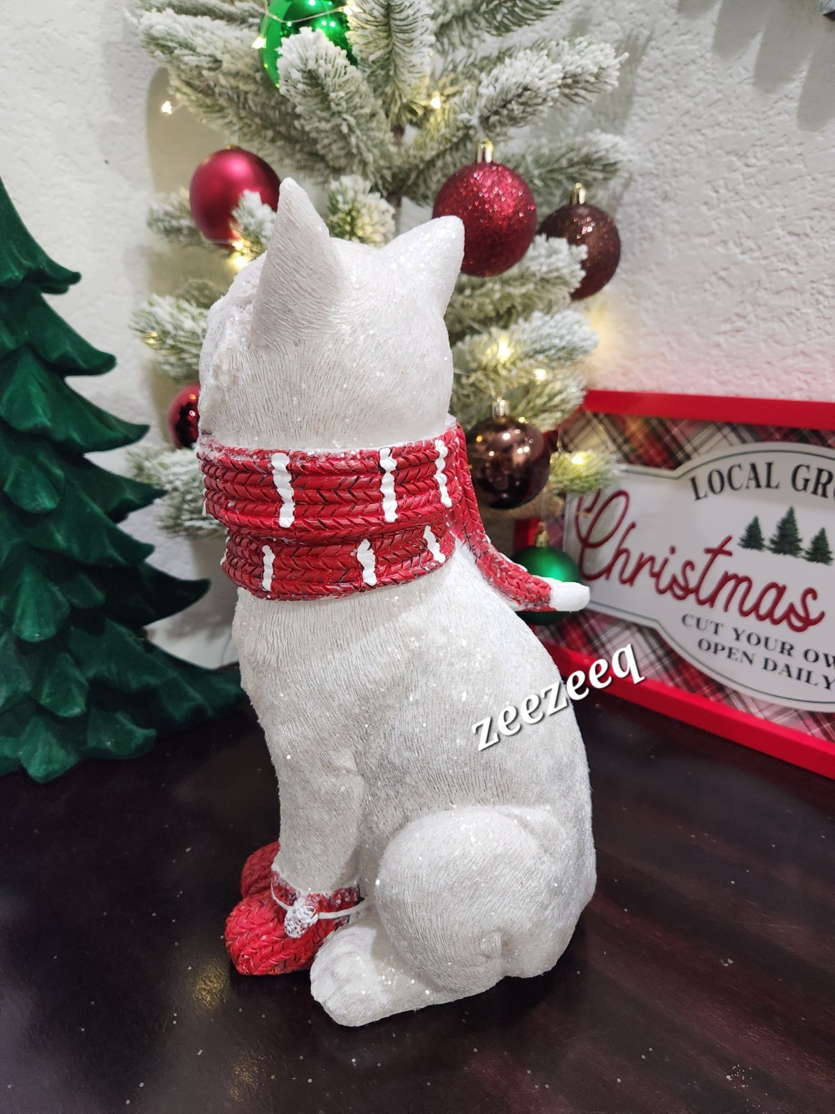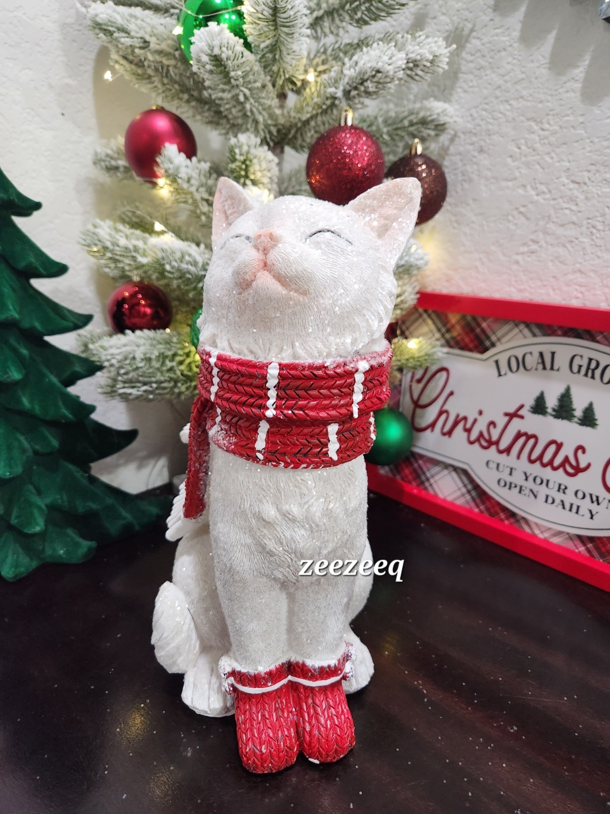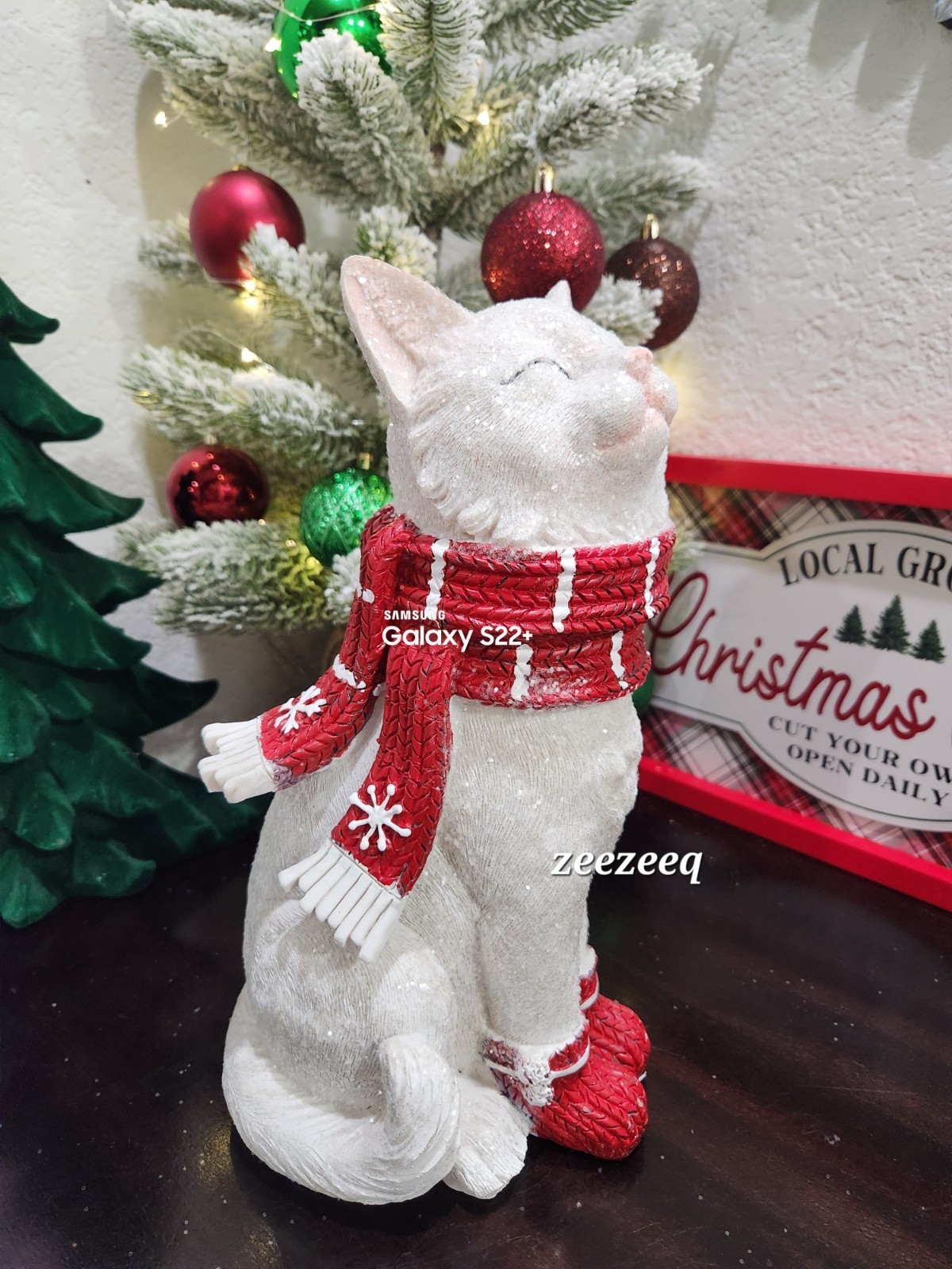 Up for sale we have this adorable kitty cat figurine for your holiday decor. This little guy will be a hit with your Christmas decor. The white kitty is wearing a white scarf and red mittens. Sooo cute! Made of resin he stands approx 11.5" tall.