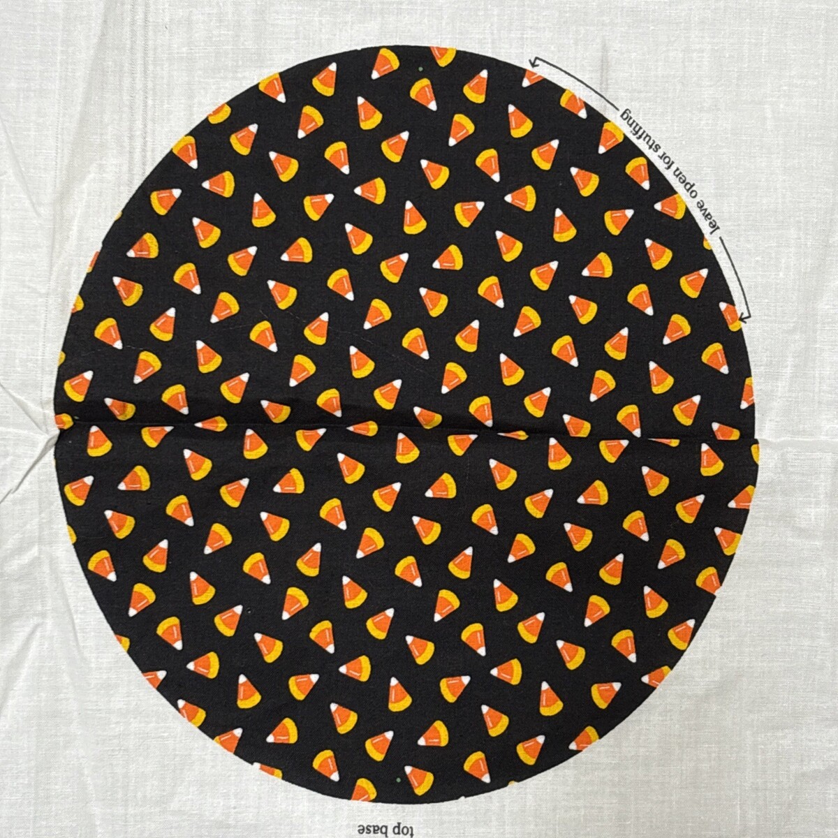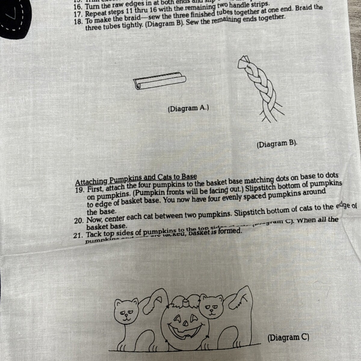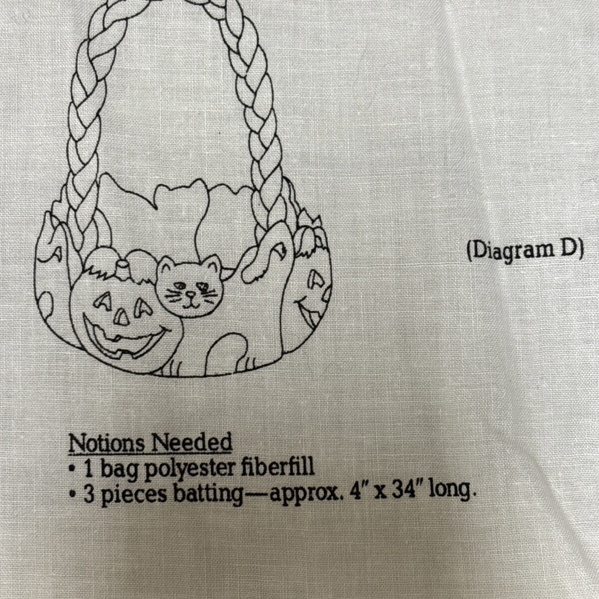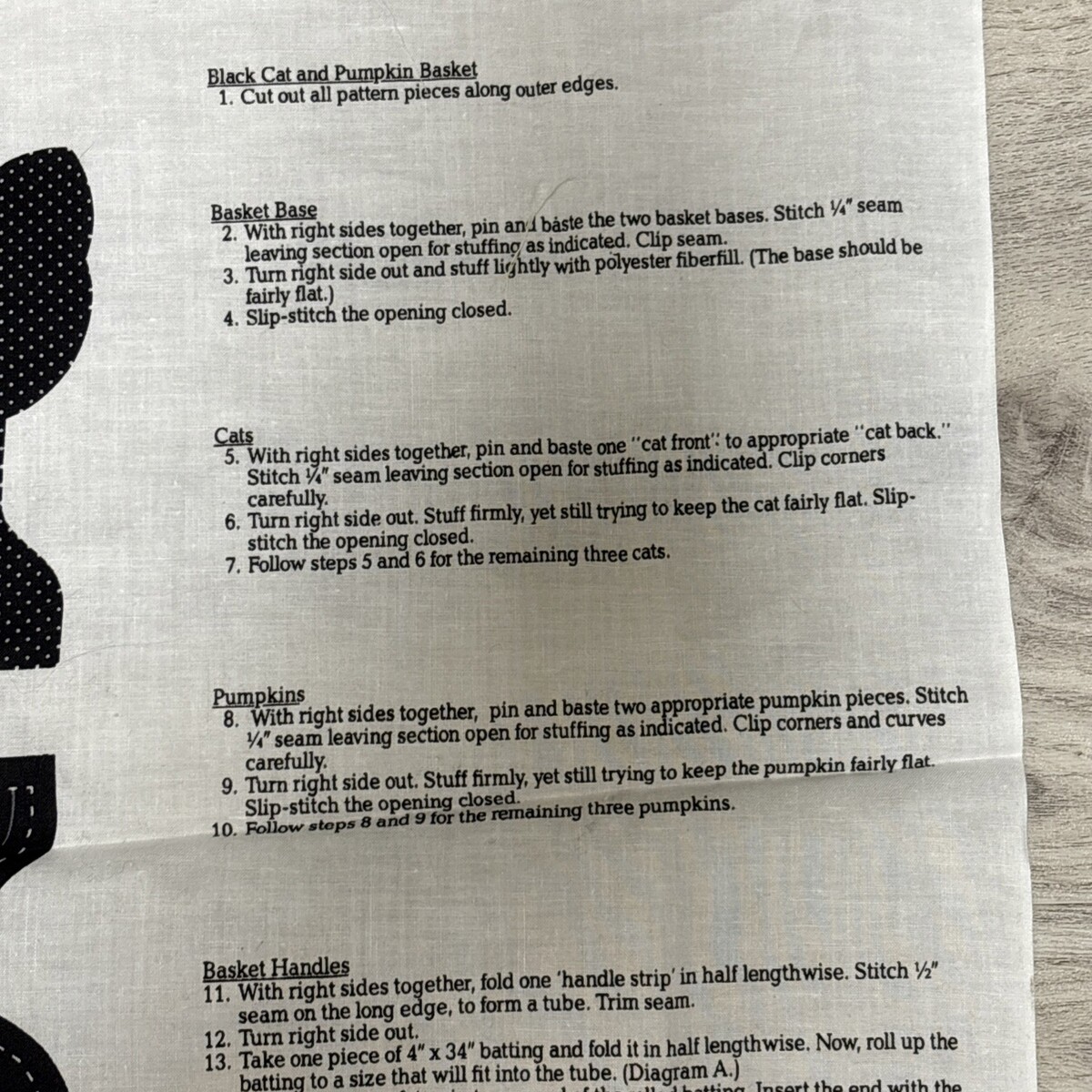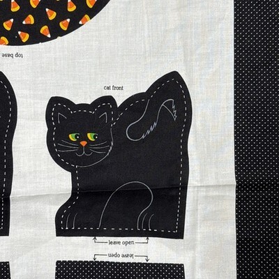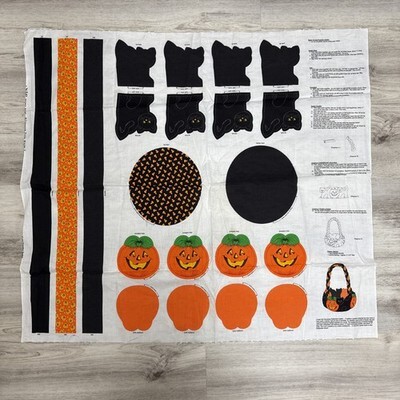 Cranston VIP Fabric Panel DIY Pumpkin Black Cat Candy Corn Basket Vintage 90s Halloween craft project Black cat, polka-dot Jack-o-Lantern and candy corn patterns 100% cotton Made in USA Single panel fabric cut and sew with directions Does not include threads, stuffing or notions Finished pumpkin measures about 12" tall (including the handle) and 10" wide Unused, new item