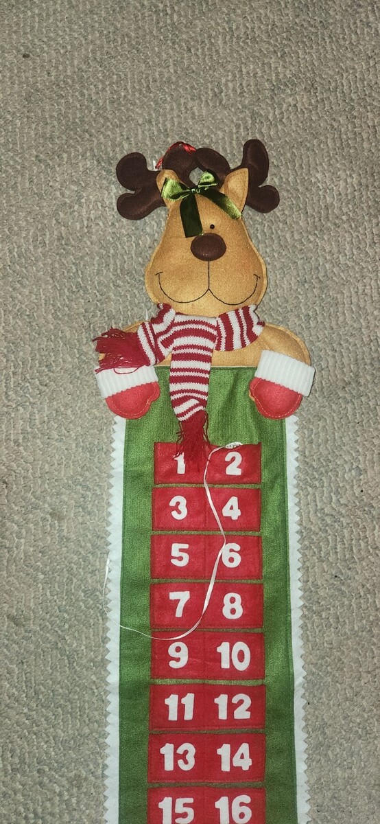Cute advent calendar. Reindeer with snowflake day counter. Measures 42 inches long. Has a bell on the bottom. Don't Forget to Follow See photos as they are an important part of the description and will help you know what you are buying. We do our best to describe all items but Sometimes we miss things so the photos are important. . Please Please ask questions. Thanks for bidding and good luck. Check out all my items for some great finds. Lots of cool stuff at my sales. can combine shipping on most. All clothing items are washed according to policy.